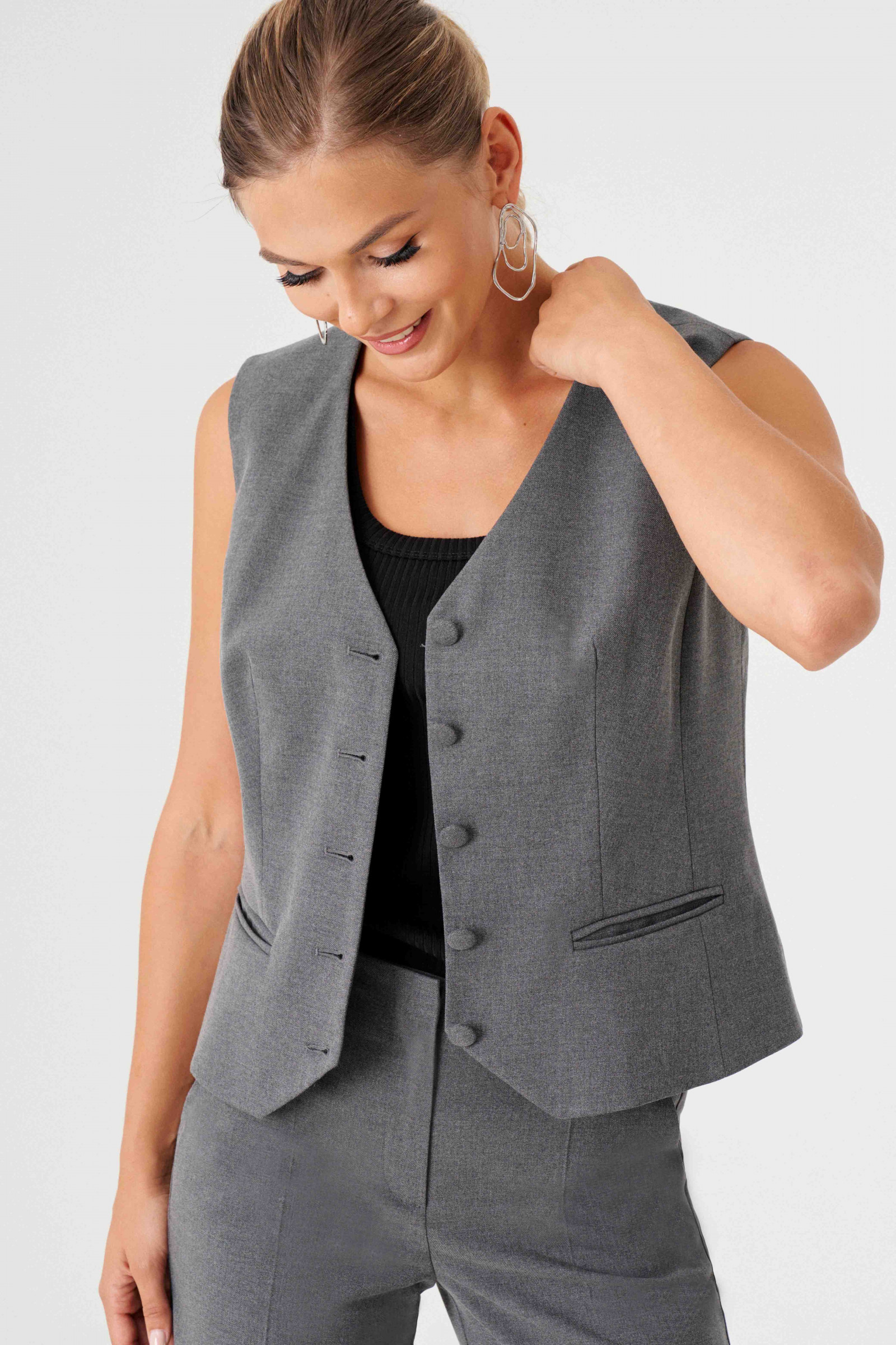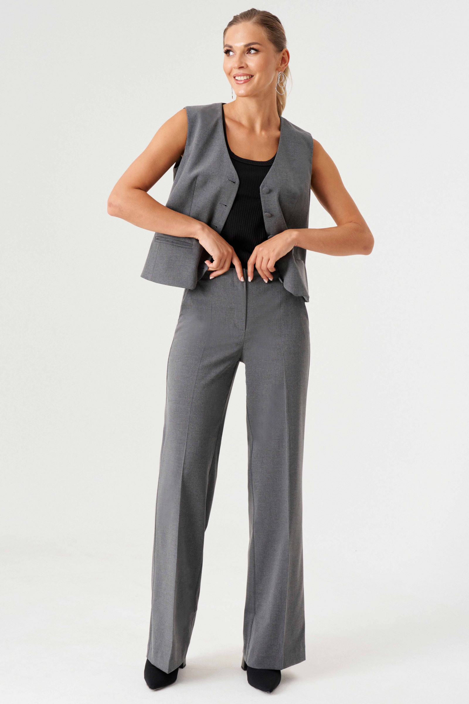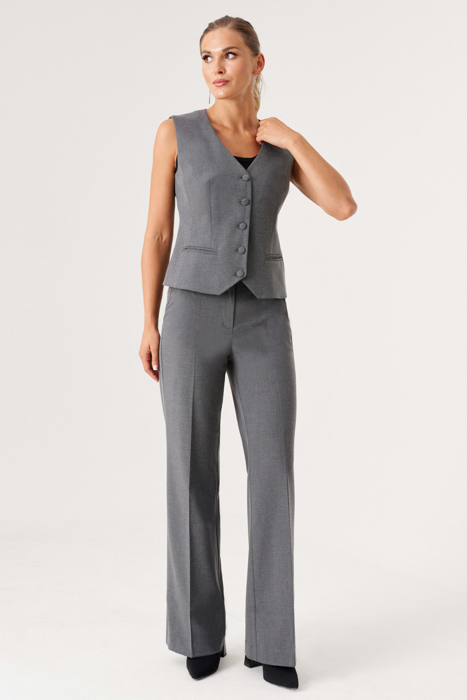 Жилет женский в классическом стиле - современная база женского гардероба. Классический жилет выполнен из костюмной ткани с V-образным вырезом, полуприлегающего кроя, подходит для образов в офис, в университет, в школу, на каждый день. Жилетка короткая на пуговицах имеет подкладка из вискозы, ее можно надевать под пиджак как первый слой (тренд сезона), под кардиган, а также сочетать с шелковыми топами, блузками женскими, водолазками, рубашками. Дополни жилеткой классическую прямую юбку, юбку мини, женские прямые брюки или брюки палаццо и даже джинсы!