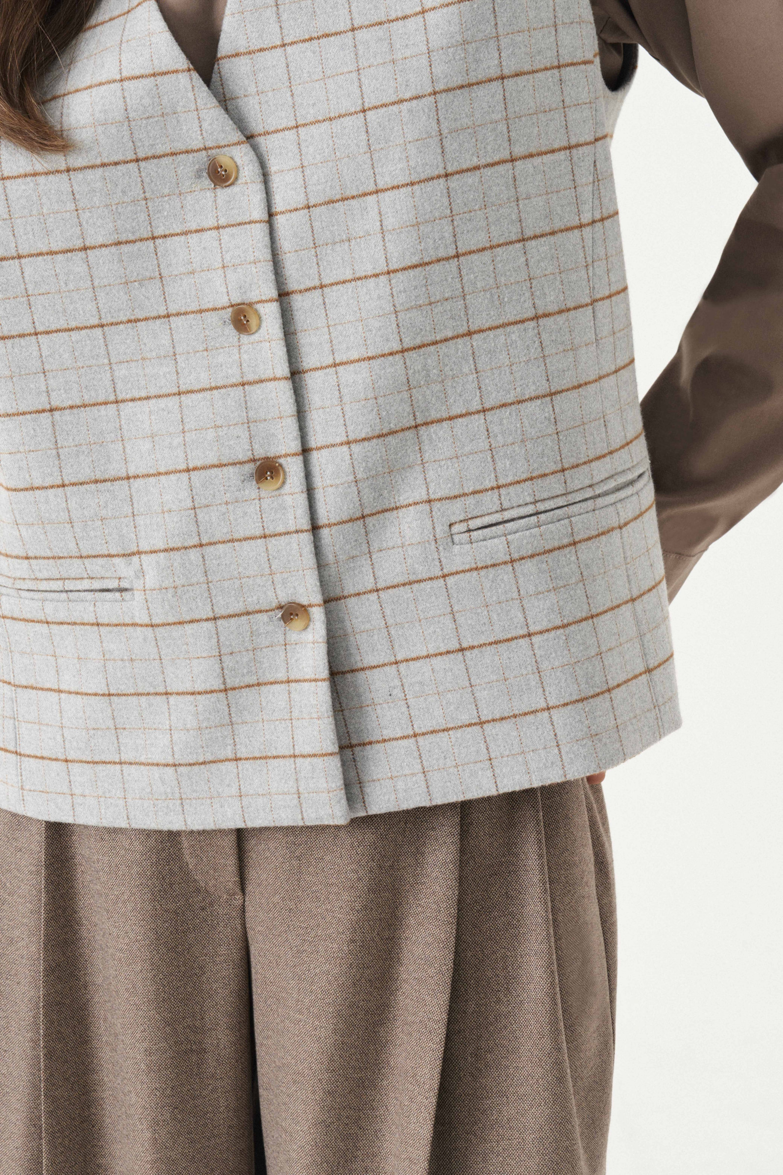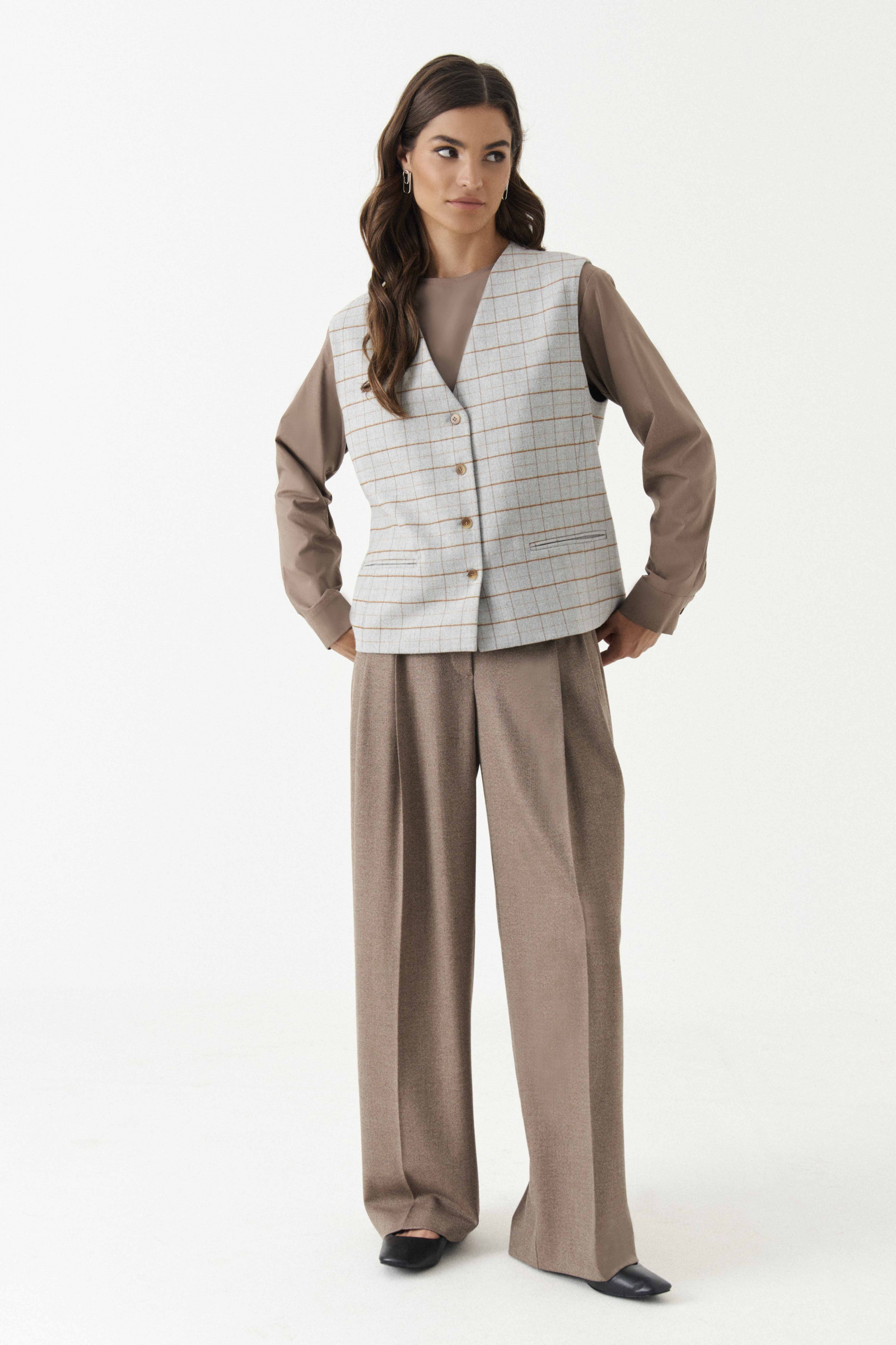 Жилет женский из смесовой ткани в клетку для повседневной носки. Жилет полуприлегающего силуэта. Жилет с центральной бортовой застежкой на четыре обметанные петли и четыре пуговицы. Перед имеет два вертикальных рельефа, идущих от проймы до низа изделия, а также на переде располагается карман с двумя обтачками. Спинка с двумя рельефами, идущими от проймы до линии низа изделия. Спинка имеет хлястик. Горловина V-образная. Жилет на поливискозной подкладке. Данное изделие станет отличным дополнением к любому гардеробу. И обязательно осчастливит его обладательницу своим прекрасным фасоном.