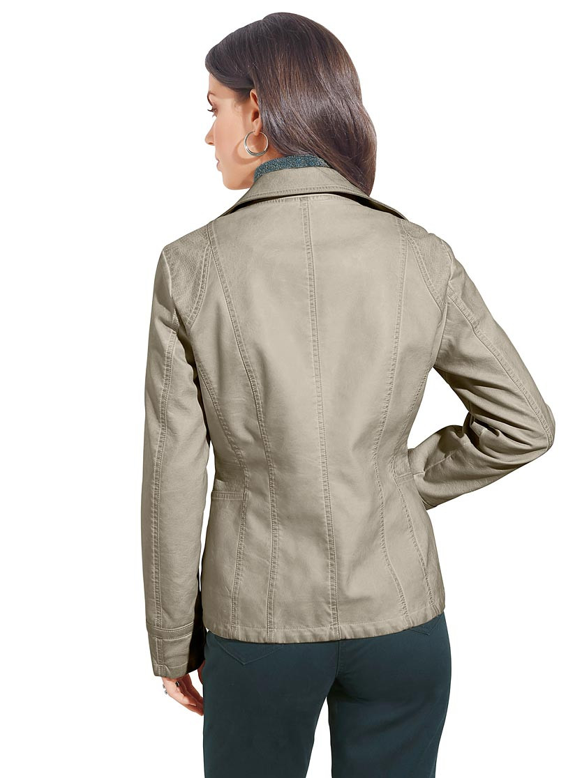 Создает настроение! Блейзер из мягкого кожзаменителя с актуальной отделкой: с серебристыми заклепками на отложном воротнике, ложных карманах и манжетах. Декоративная простежка на плечах и по бокам. Застежка-молния по всей длине, 2 кармана, 1 потайной карман на молнии.