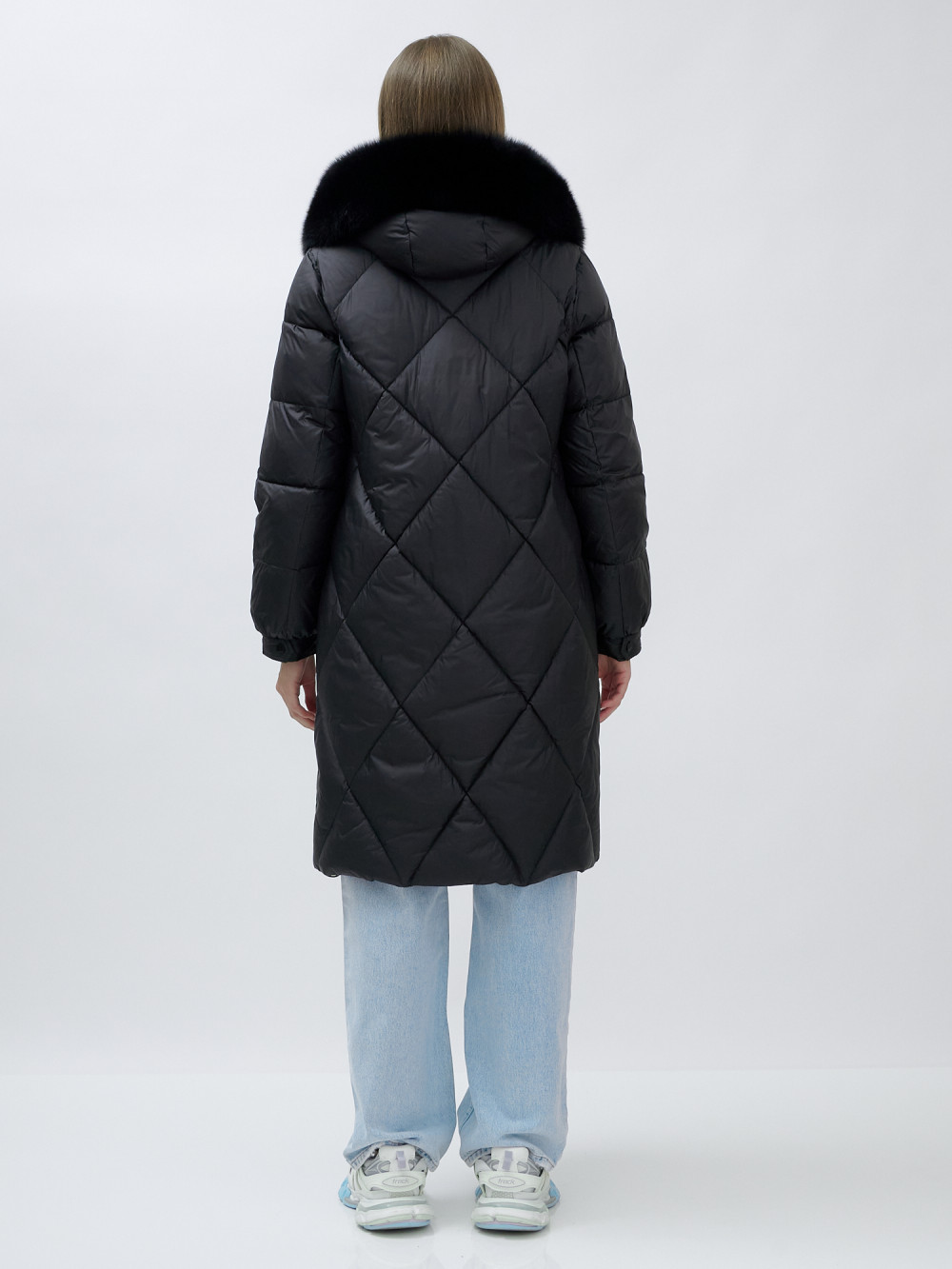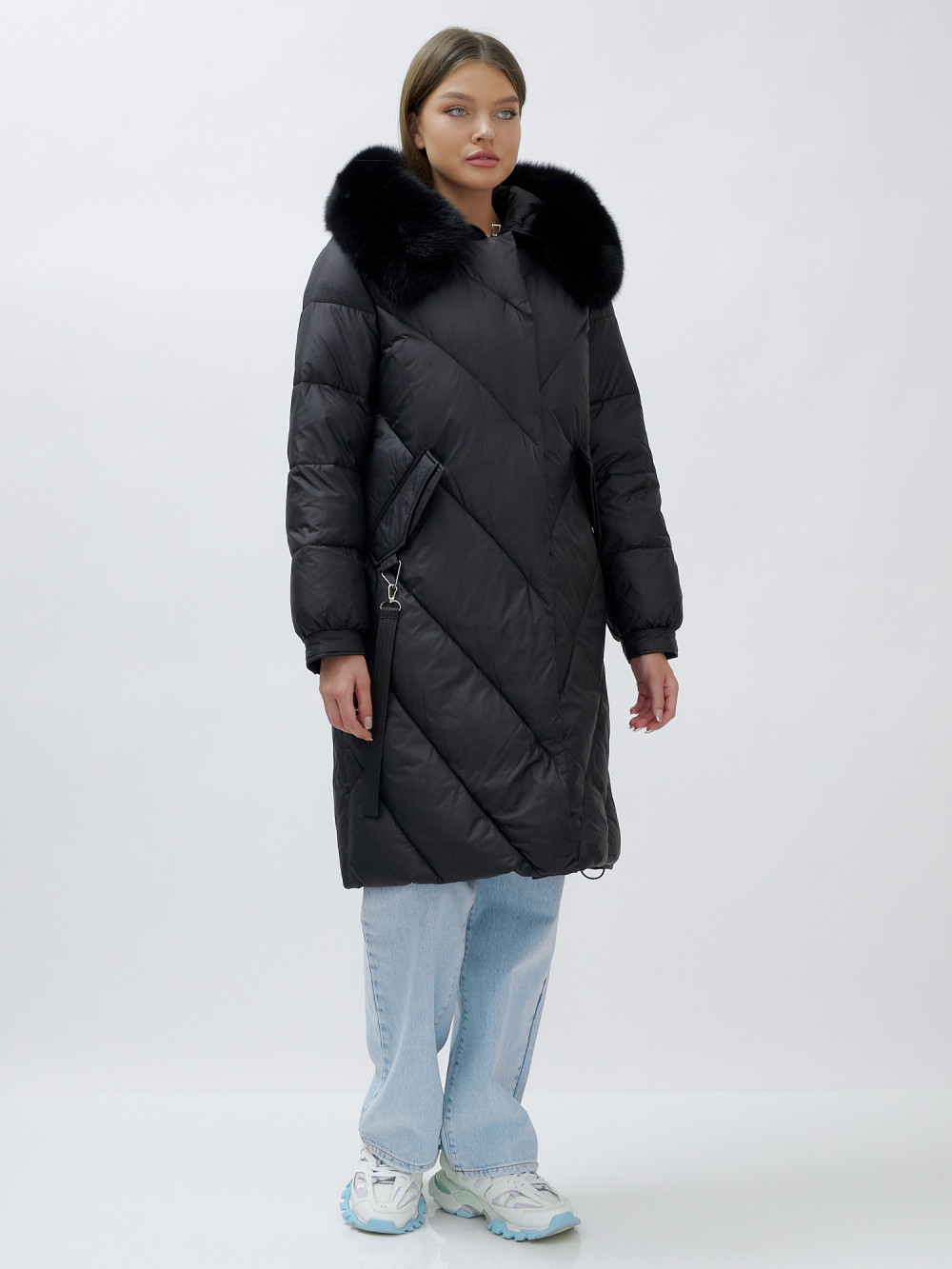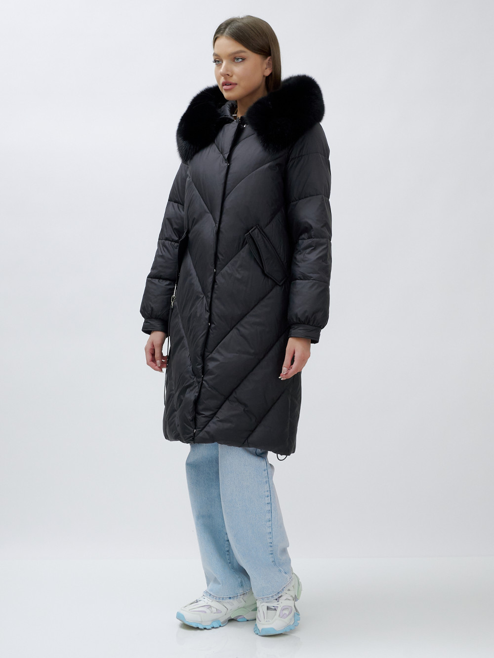 Пальто женское зимние с мехом песец люкс класса черного цвета 1316Ch