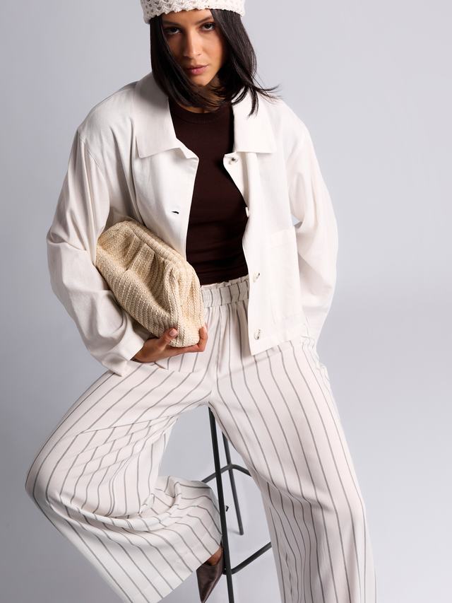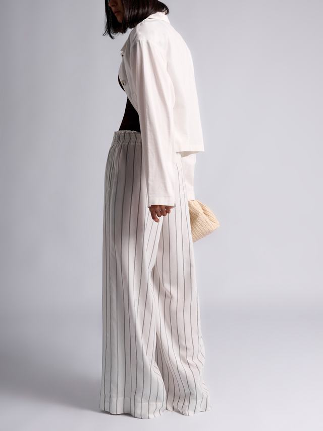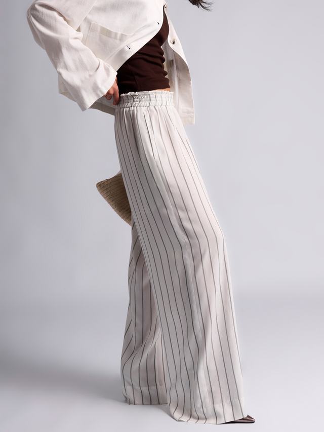 Трендовый принт вертикальной полоски удлиняет ноги и стройнит. Резинка на талии с необычной деталью помогает брюкам сидеть безукоризненно и выделять обладательницу из толпы.