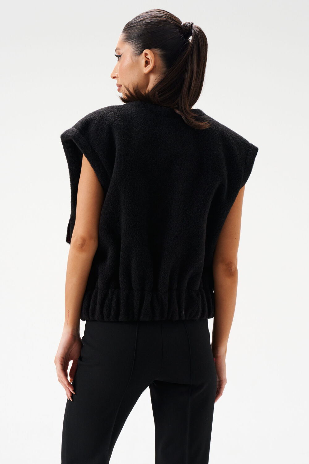 Жилет прямого кроя выполнен из приятного, теплого полотна черного цвета. Характеристики: прямой крой, горловина круглая отстроченная, подкладка, застежка центральная на акцентные петли пуговицы, по переду крупные накладные карманы, низ изделия на резинке. Длина по спинке 53 см.