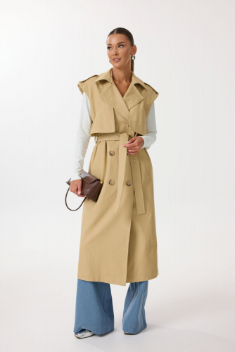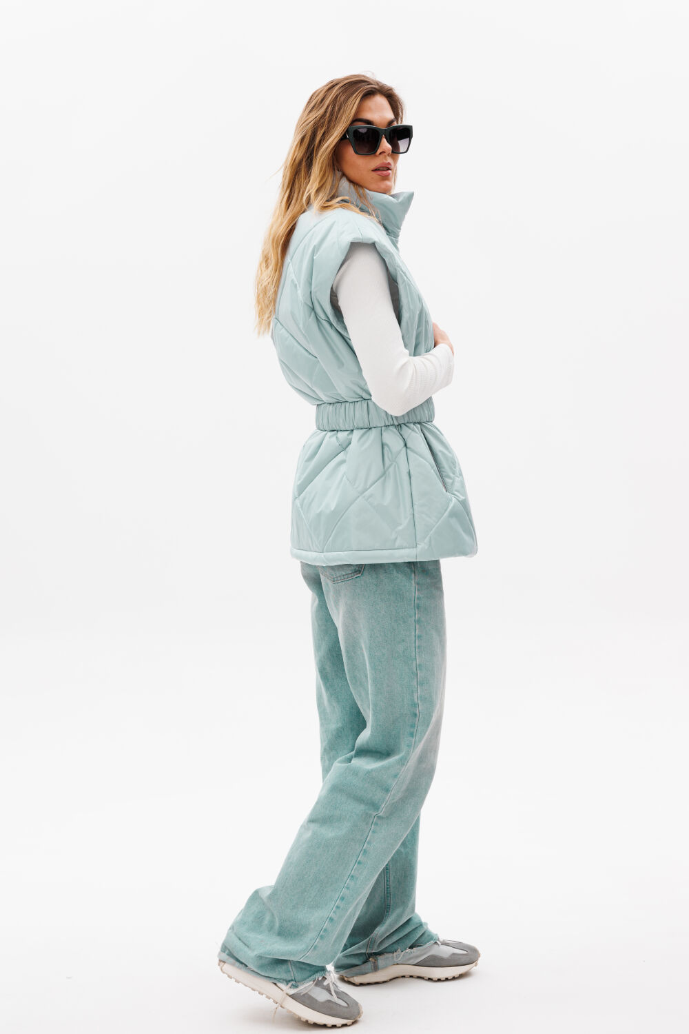 Жилет женский  стёганный из плащёвой ткани на синтепоне.  Прямого силуэта под пояс с эластичной тесьмой и пряжкой. Стёжка ромбами, со спущенным плечевым швом, с карманами по переду на молнии, с воротником-стойкой и застёжкой спереди на молнию.