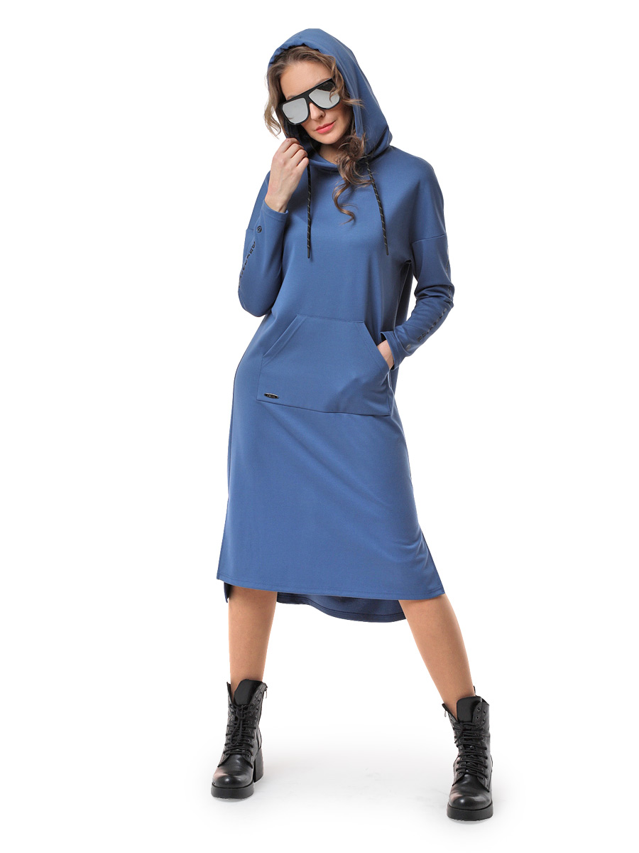Платье прямого силуэта с заниженной линией плеча и длинными рукавами. Капюшон втачной, с затяжкой. Накладные карманы по типу "кенгуру". Линия низа разноуровневая; в боковых швах обработаны разрезы. Одежда из мягкого футера все увереннее переходит из категории домашней одежды в категорию повседневной. В таком платье спортивного стиля Вы не только будете комфортно чувствовать себя, но и выглядеть очень современно!