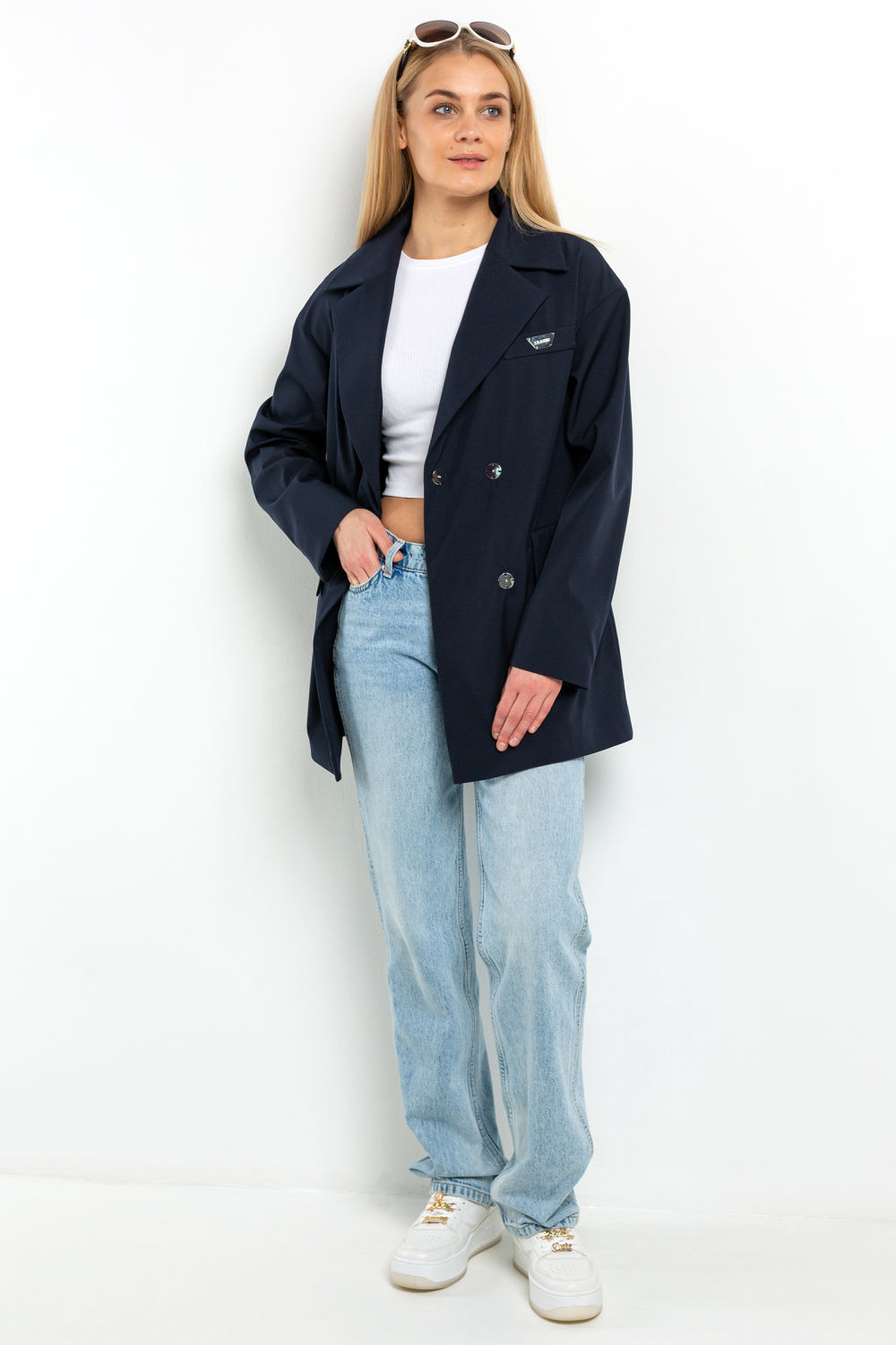 Не так давно женские ветровки подразумевали только практичный спортивный фасон, сегодня модные ветровки стали более разноплановыми, поскольку выполнены они в различных стилях, в том числе и в элегантных моделях. Женская ветровка-жакет обладает свободным кроем, приспущенной линией плеч, а также имеет длину до середины бедра. Английский воротник, двубортная застежка на пришивные кнопки. На переде карманы с клапанами и декоративная нагрудная листочка с металлическим декором. Пояс в комплекте. Ткань бондинг состоит из двух слоев: верхний слой костюмная ткань, нижний слой-тонкое трикотажное полотно. Такое сочетание придает ему нужную плотность, хорошо пропускает воздух.