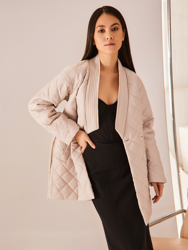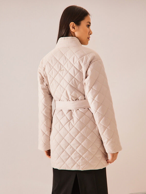 Стеганый плащ-кимоно прямого силуэта. Рукав со спущенным плечом. Застежка двубортная на пуговицы. В изделии два кармана, оформленных листочками на потайных кнопках и один внутренний карман. В комплекте с плащом идет пояс из основной ткани. Ткань плащевая с водоотталкивающей пропиткой, простеганная ромбом. Утепление нового поколения ORSOTHERM 100 гр. (от +15°C до +20°C ). Длина изделия: 80 см. Длина рукава: 64 см. Размеры: 42-56.