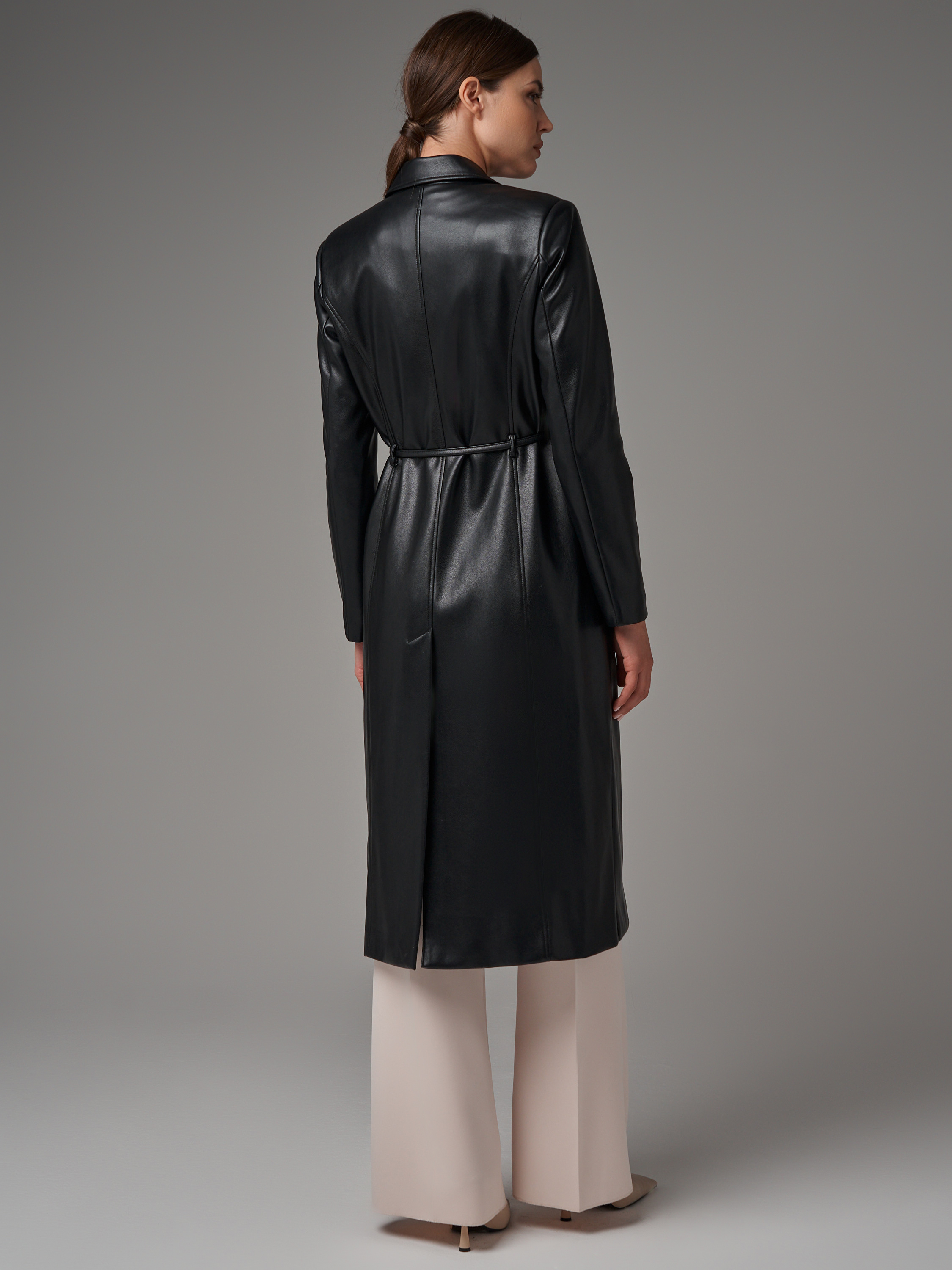 Длина изделия по спинке: 117 см Длина рукава: 64 см Плотность утеплителя: без утепления.. Рекомендуемый температурный режим: от +13°C до +20°C Покрой: прямой,полуприталенный Тип рукава: втачной Тип карманов: прорезные с клапанами Состав: высококачественная экокожа 100% PU Материал подкладки: 100% полиэстер Размеры: S, M, L Детали: застежка на пуговицы, в комплекте пояс из основной ткани.