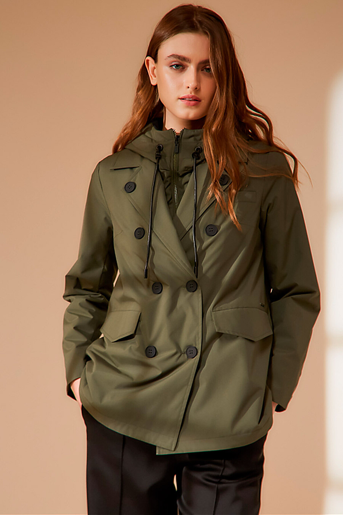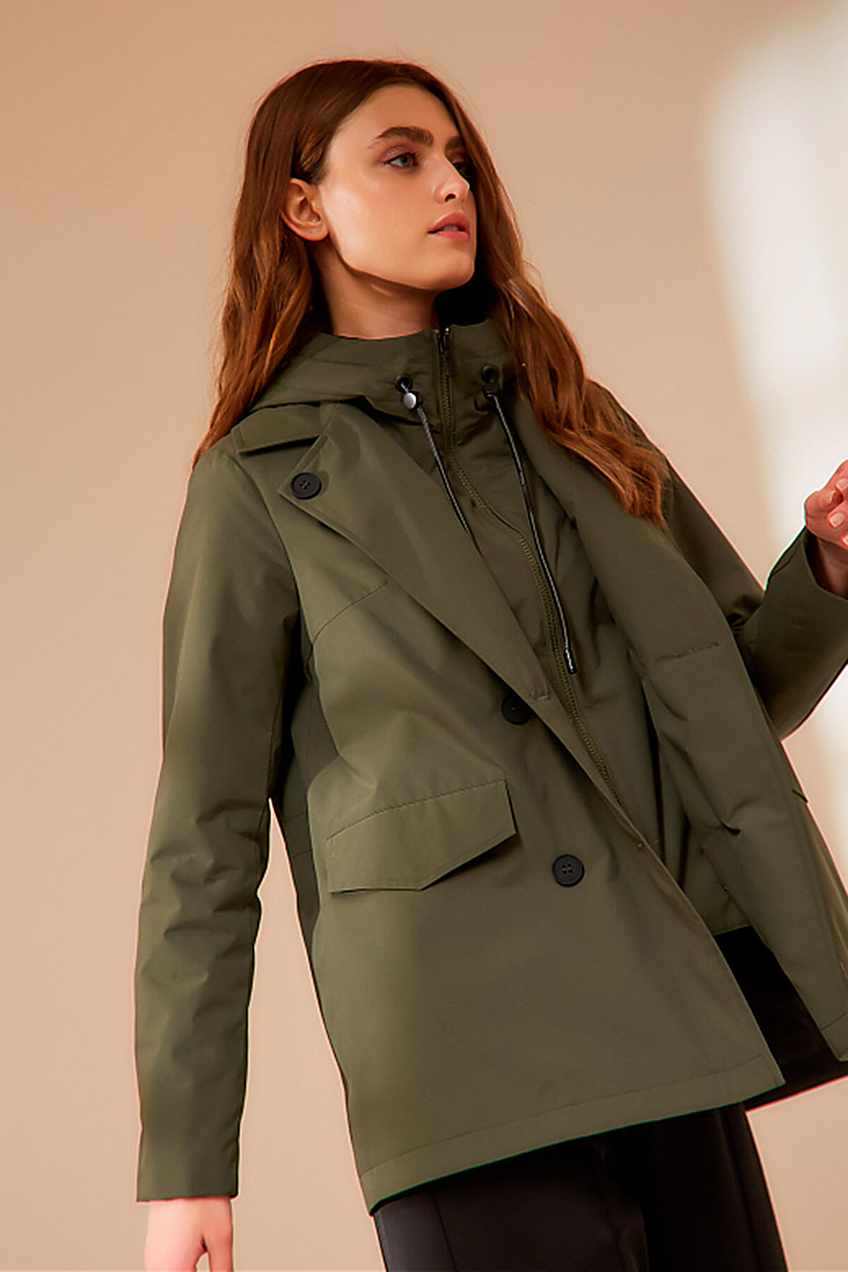 Стильный двубортный короткий плащ с внутренней съемной манишкой с капюшоном. Утяжка капюшона выполнена из эко-кожи. Имеются два функциональных прорезных кармана под клапанами. По спинке идет кулиска в районе талии. Есть внутренний карман. Ткань изделия обработана качественной водоотталкивающей пропиткой. Утепление нового поколения ORSOTERM 60 гр., рекомендуемый температурный режим от +15°C до +20°C. Длина изделия: 72 см. Длина рукава: 64 см. Размеры: 42 - 56.