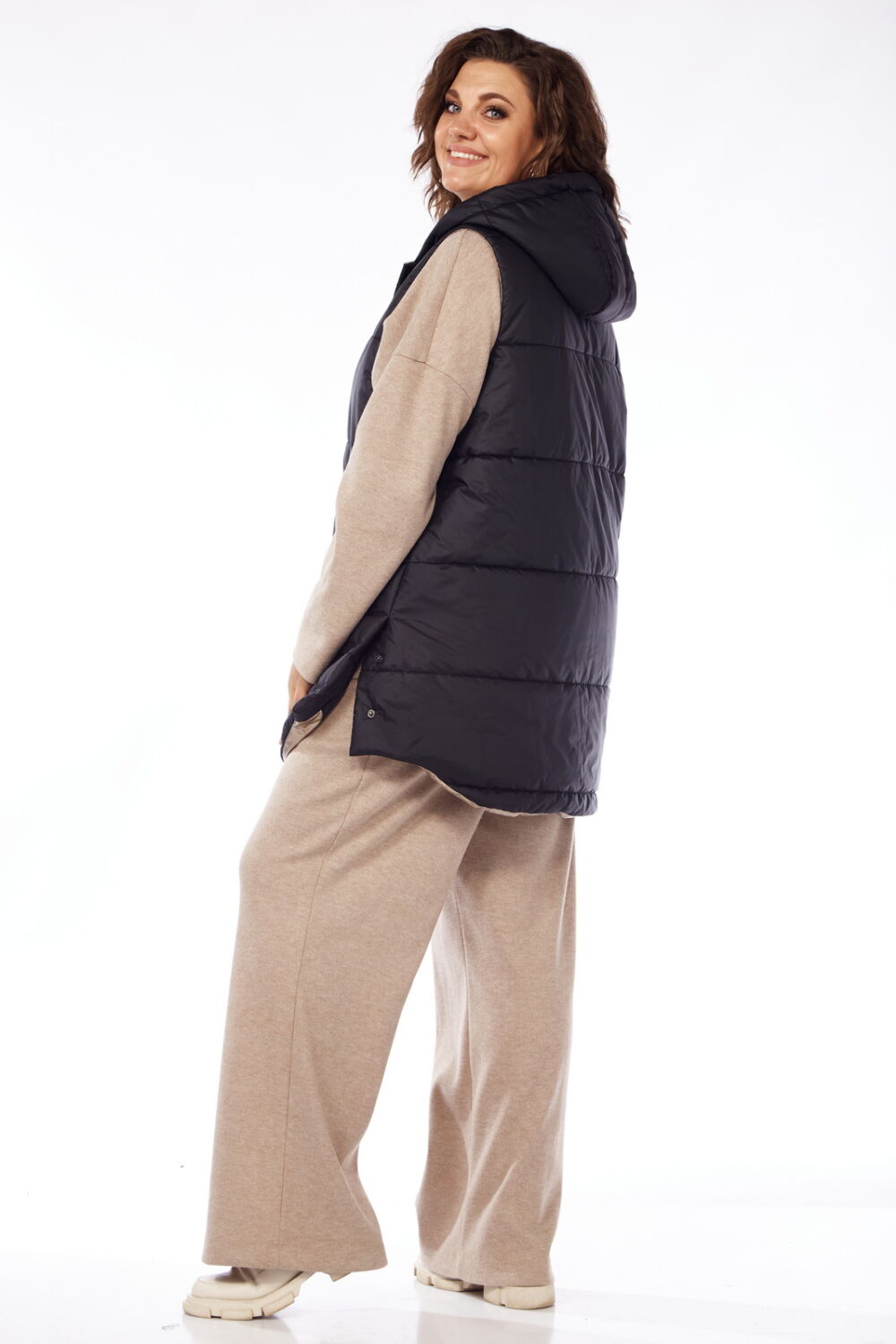 Жилет женский изготовлен из стеганой курточной ткани на синтепоне. Горловина оформлена капюшоном, с кулисой и втянутым шнуром с фиксатором. По переду обработаны карманы с листочками. Спинка цельнокроеная. Застежка на кнопки. Низ в изделии фигурный.В боковых швах по низу обработаны шлицы с кнопками. Декором служит нашивка на левой полочке. Температурный режим до -5.