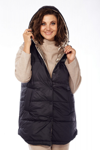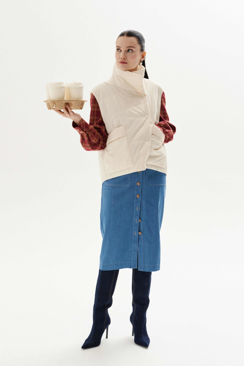 Жилет свободного кроя из плательной ткани на подкладке на синтепоне. По горловине воротник-стойка, по бокам накладные карманы. Застёжка на кнопки.