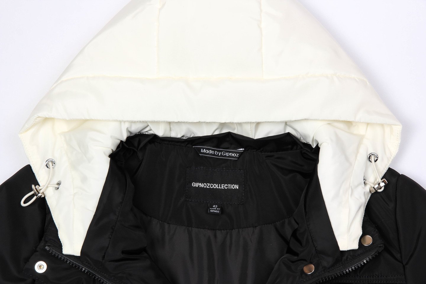 Легкое пальто из плащевой ткани — отличный вариант на межсезонье, плотная ткань защитит от ветра и дождя. Изделие прямого силуэта, объем изделия свободный. Отличительная особенность — отстегивающийся капюшон цвета слоновой кости прекрасно смотрится около лица. Накладные карманы уже несколько сезонов очень популярны — также присутствуют в нашей модели. По линии низа спинка длиннее переда. Утеплитель термофин, плотность 100. черный