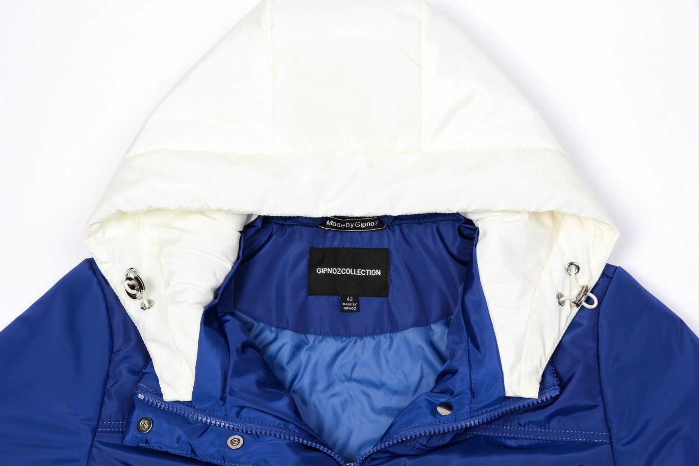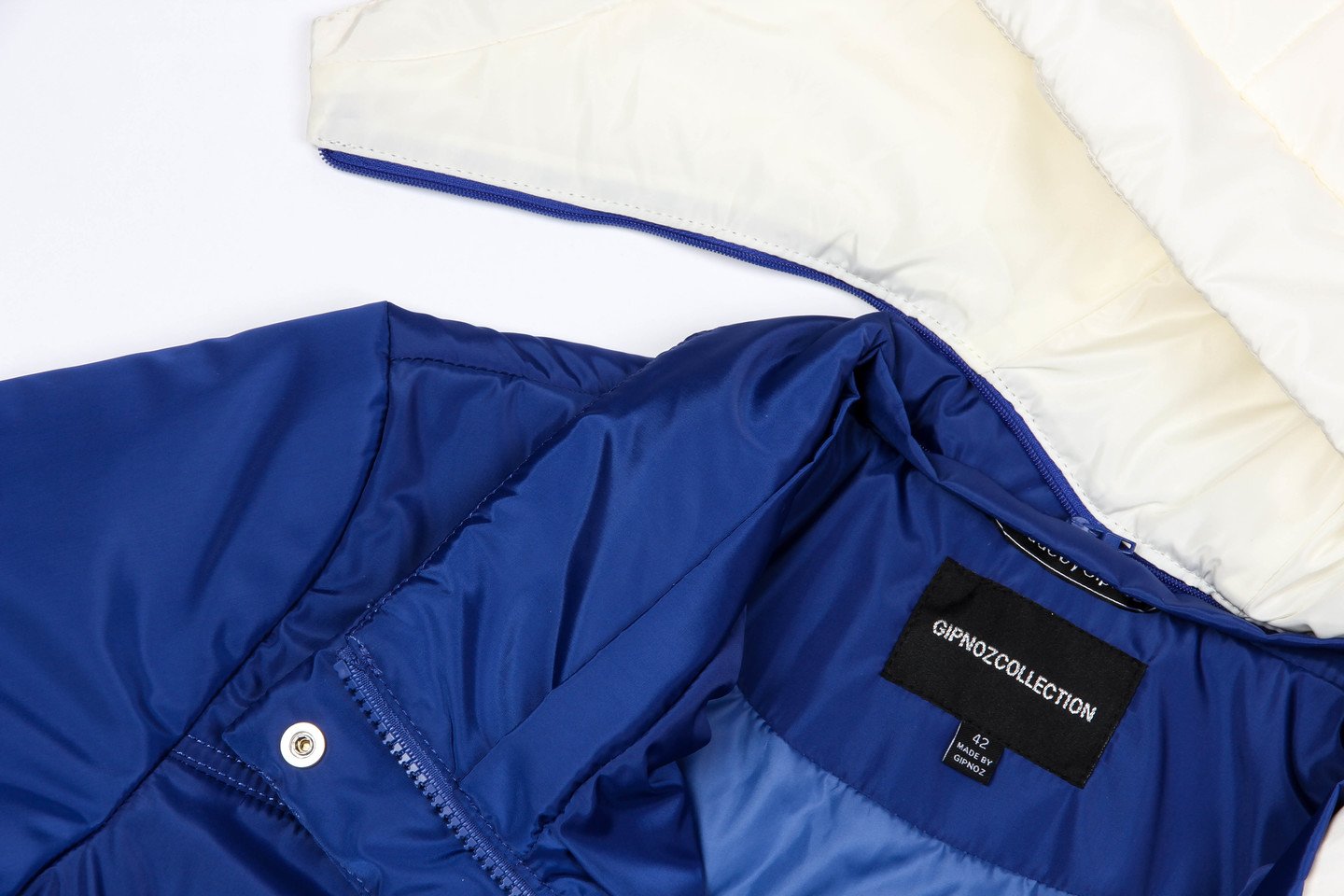 Легкое пальто из плащевой ткани — отличный вариант на межсезонье, плотная ткань защитит от ветра и дождя. Изделие прямого силуэта, объем изделия свободный. Отличительная особенность — отстегивающийся капюшон цвета слоновой кости прекрасно смотрится около лица. Накладные карманы уже несколько сезонов очень популярны — также присутствуют в нашей модели. По линии низа спинка длиннее переда. Утеплитель термофин, плотность 100. ярко-синий