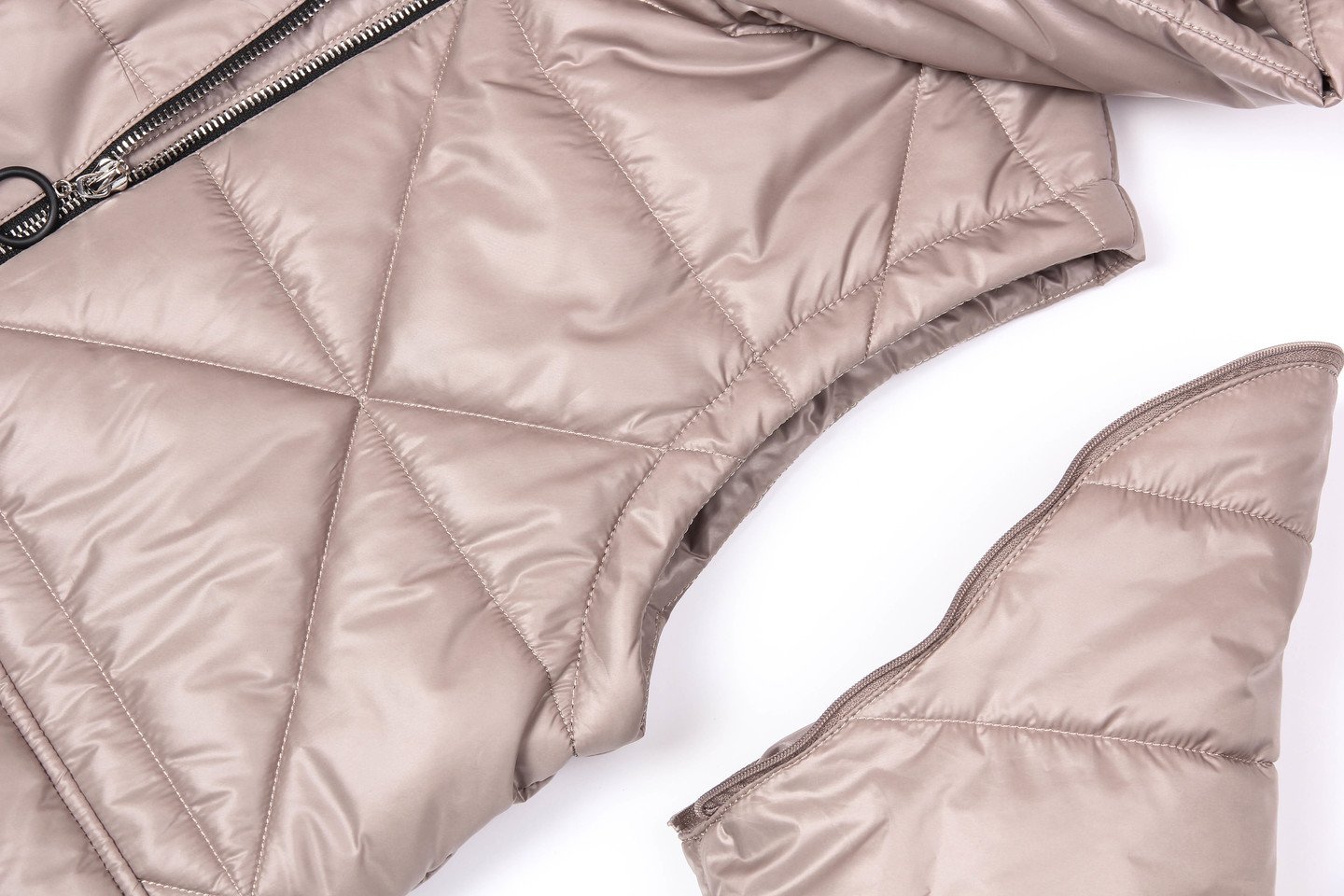 Легкое пальто-трансформер с отстегивающимися рукавами на утеплителе термофин – отличный вариант на межсезонье. Главная изюминка нашей модели - отстегивающиеся рукава – превращают пальто в жилет, который вы можете носить и в более теплое время года. Рукава пристегиваются на молнию, могут отгибаться на манжет. Прямой силуэт, умеренный объем изделия, современный дизайн – обеспечивают актуальность данной модели. Большие накладные карманы не только удобны в использовании, но и являются одной из модных тенденций. Со стороны спинки модель имеет очень легкое приталивание, спинка длиннее переда на 5 см. Капюшон делает пальто более практичным и удобным в использовании, особенно в дождливую и прохладную погоду. Утеплитель термофин, плотность 200. кремовый