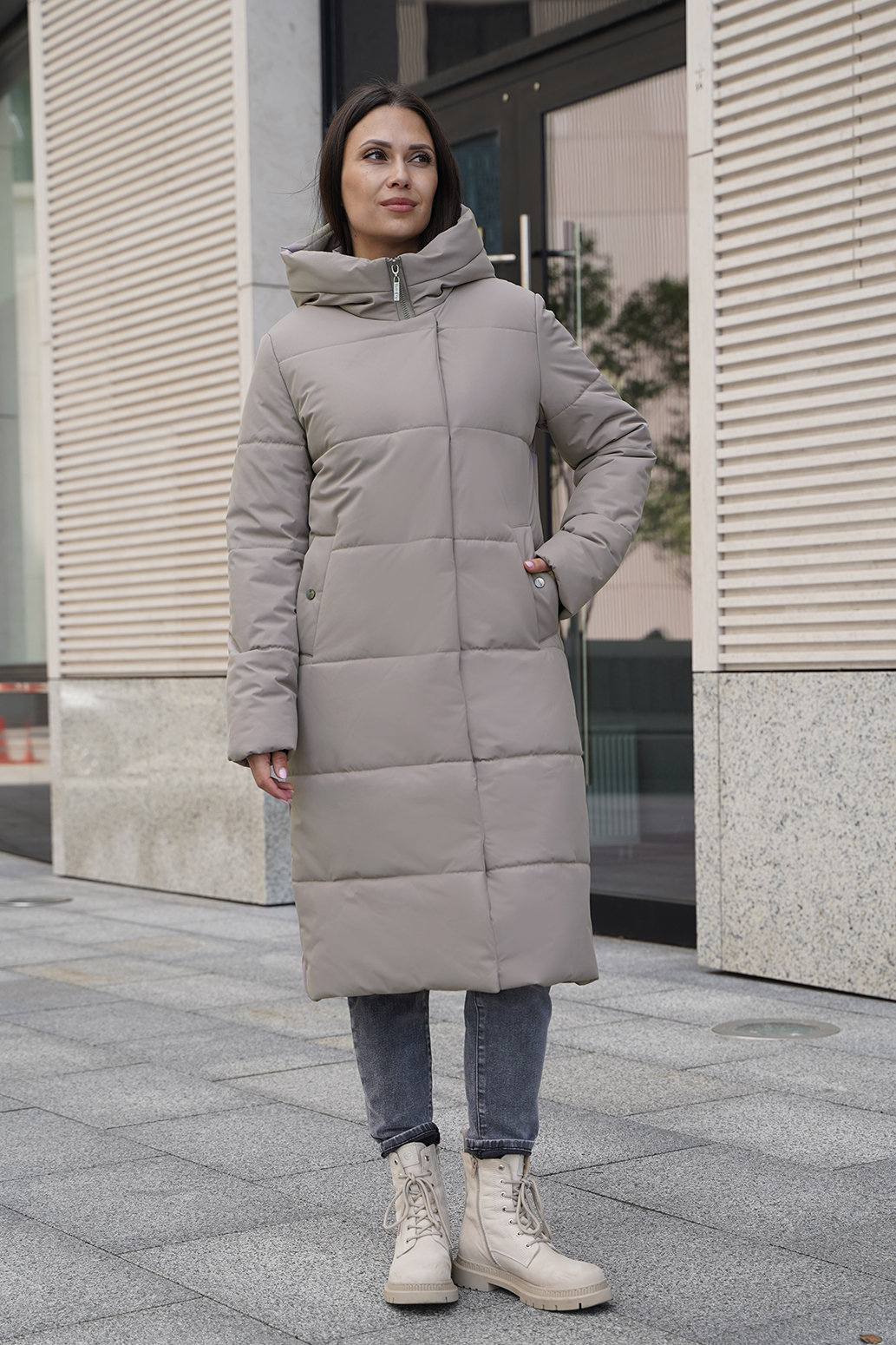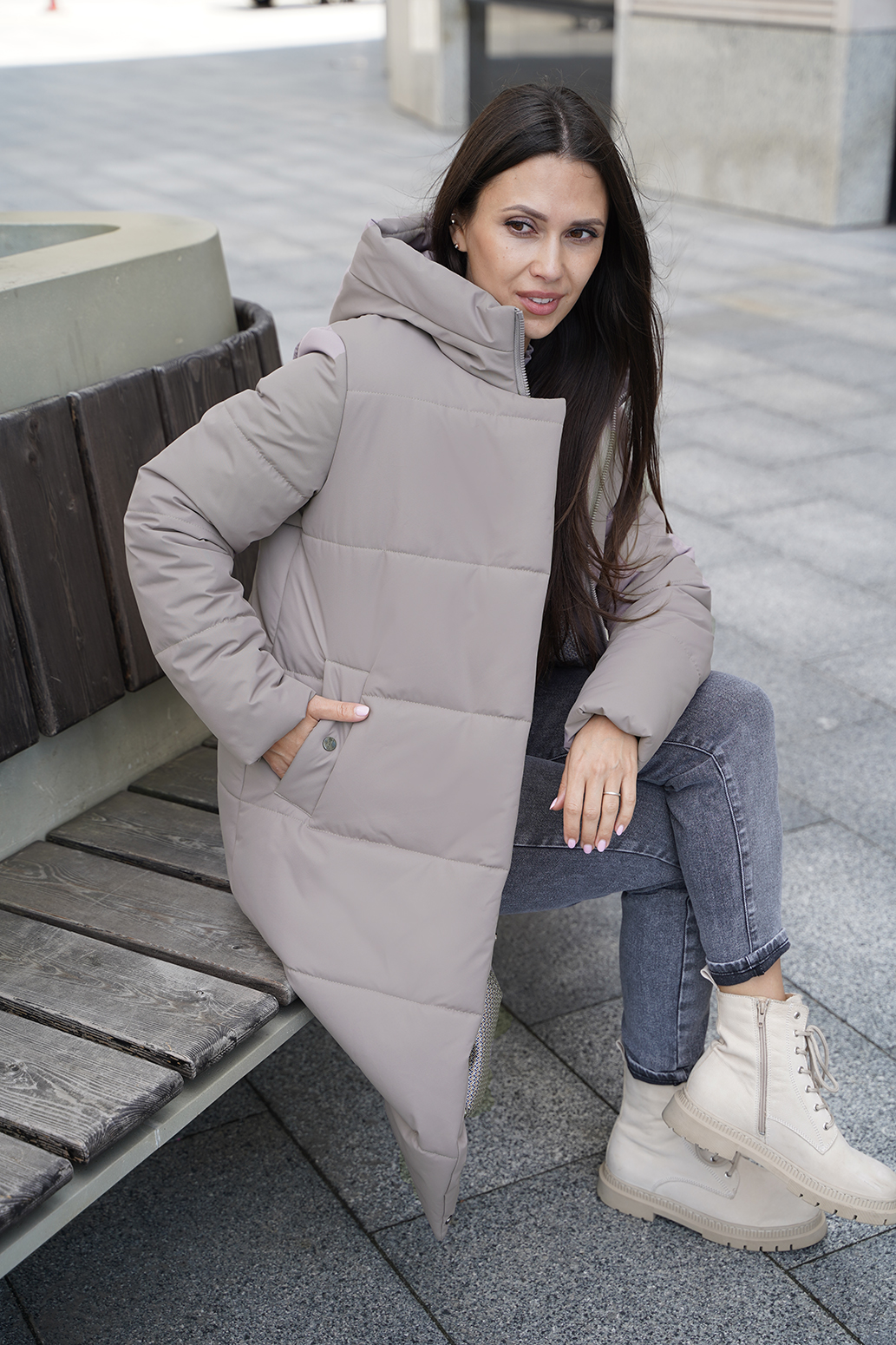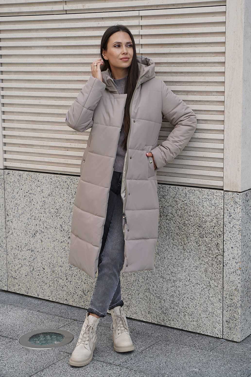 Стильное зимнее пальто, сочетающего функциональность и элегантность. Плотная ткань с горизонтальной стежкой создает интересную текстуру, а утеплитель обеспечит тепло в холодную погоду. Цельнокроенная планка с потайными кнопками и молнией с тракторным звеном придают пальто современный и аккуратный вид. Карманы-листочки застегиваются на видовую кнопку и добавляют нотки изящества и классики. Такое пальто — идеальный выбор для зимних прогулок и городских будней, сочетая практичность с стилем.