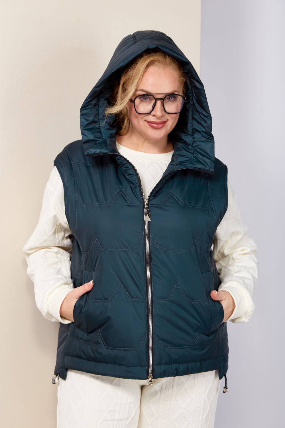 Женская жилетка с капюшоном, идеальное решение для весенних прогулок. Это классический и стильный дизайн для повседневного образа. Изделие выполнено из мягкой курточной ткани высокого качества, на тонком синтепоне. На подкладке. Жилетка повседневная удобная в носке, лёгкая в уходе и теплая. По переду центральная застежка на молнии (двухбегунковая) и действующие карманы прорезного типа на кнопках. Капюшон не сьемный. Модель чуть укороченная спереди и удлиненная сзади, что придает изделию оригинальный вид. Низ изделия на регулируемой кулисе. С внутренней стороны жилетки имеетня внутренний карман. Свободный крой обеспечивает идеальную посадку на любую фигуру, а углубленная пройма позволит носить утепленные худи, плотный трикотаж из различных материалов не сковывая ваших движений.