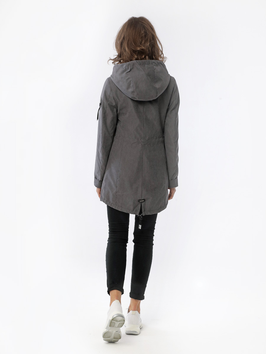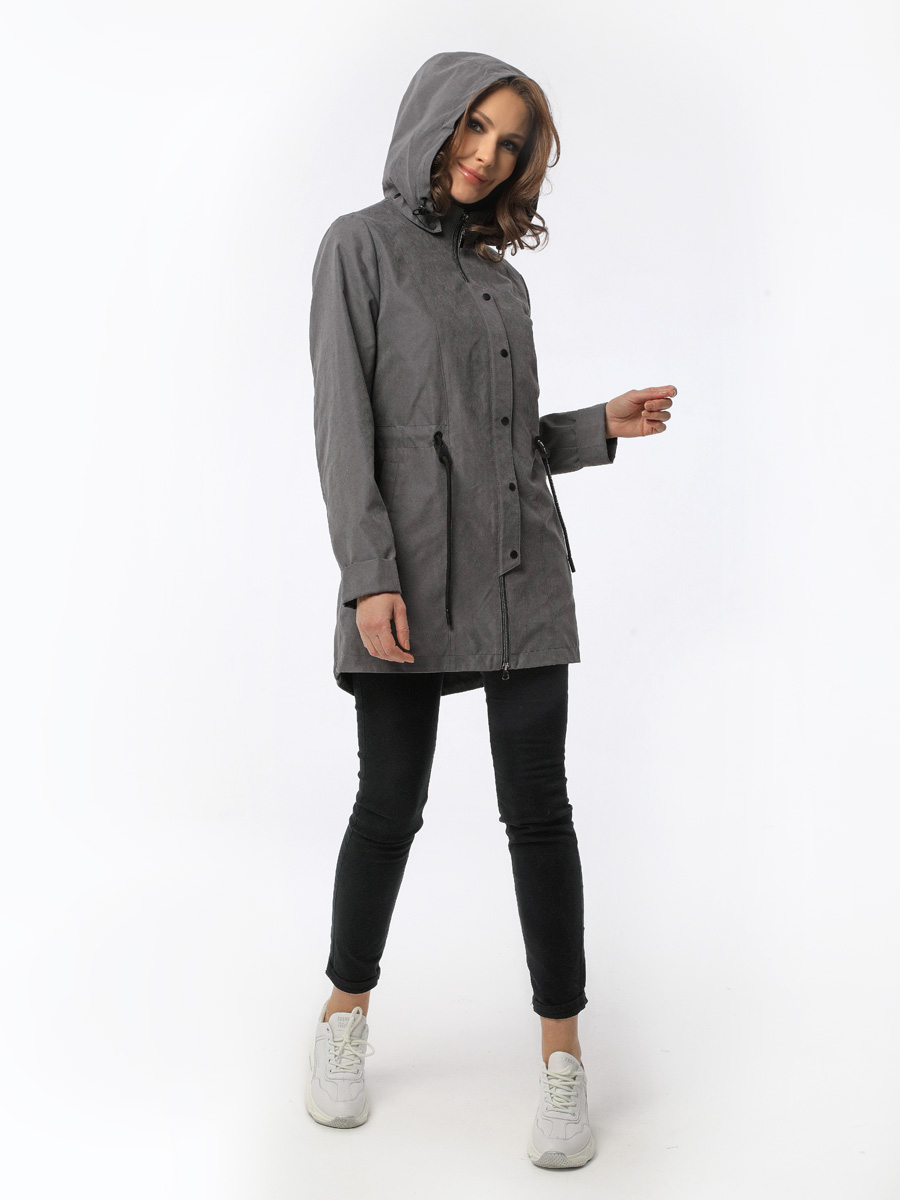 Ветровка прямого силуэта с втачными рукавами и застежкой на двухзамковую молнию и кнопки. Воротник - стойка, капюшон съемный. Внешние прорезные карманы на кнопке, а один внутренний застегивается на молнию. Длину рукава можно менять посредством отворота, а линию талии подчеркнуть с помощью кулиски. Подкладка в изделии выполнена из ткани в мелкую полоску.