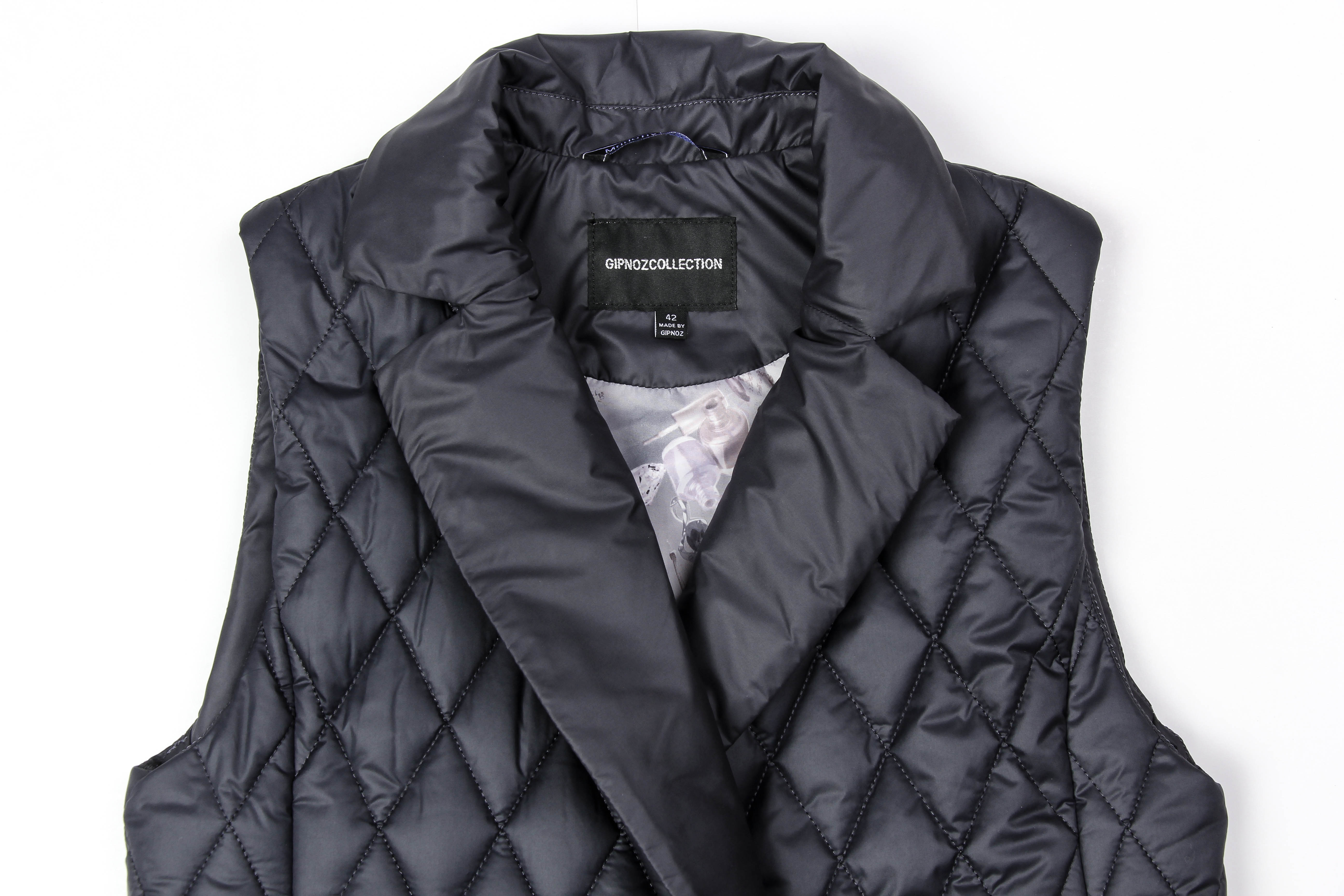 Теплые женские жилеты — не новый тренд, тем не менее его популярность усилилась, благодаря универсальности, практичности этой одежды среди других фасонов. Удлиненный жилет из стеганой ткани смотрится стильно и будет согревать вас в холодную погоду. Жилет прямого силуэта с английским воротником. Застежка двубортная на петли и пуговицы. Спереди карманы в швах и декоративные клапаны. На спинке – декоративный пояс на пуговицах. «Изюминку» в модель вносит сочетание стеганой ткани и деталей из гладкой ткани. Утеплитель термофин, плотность 100. черно-синий