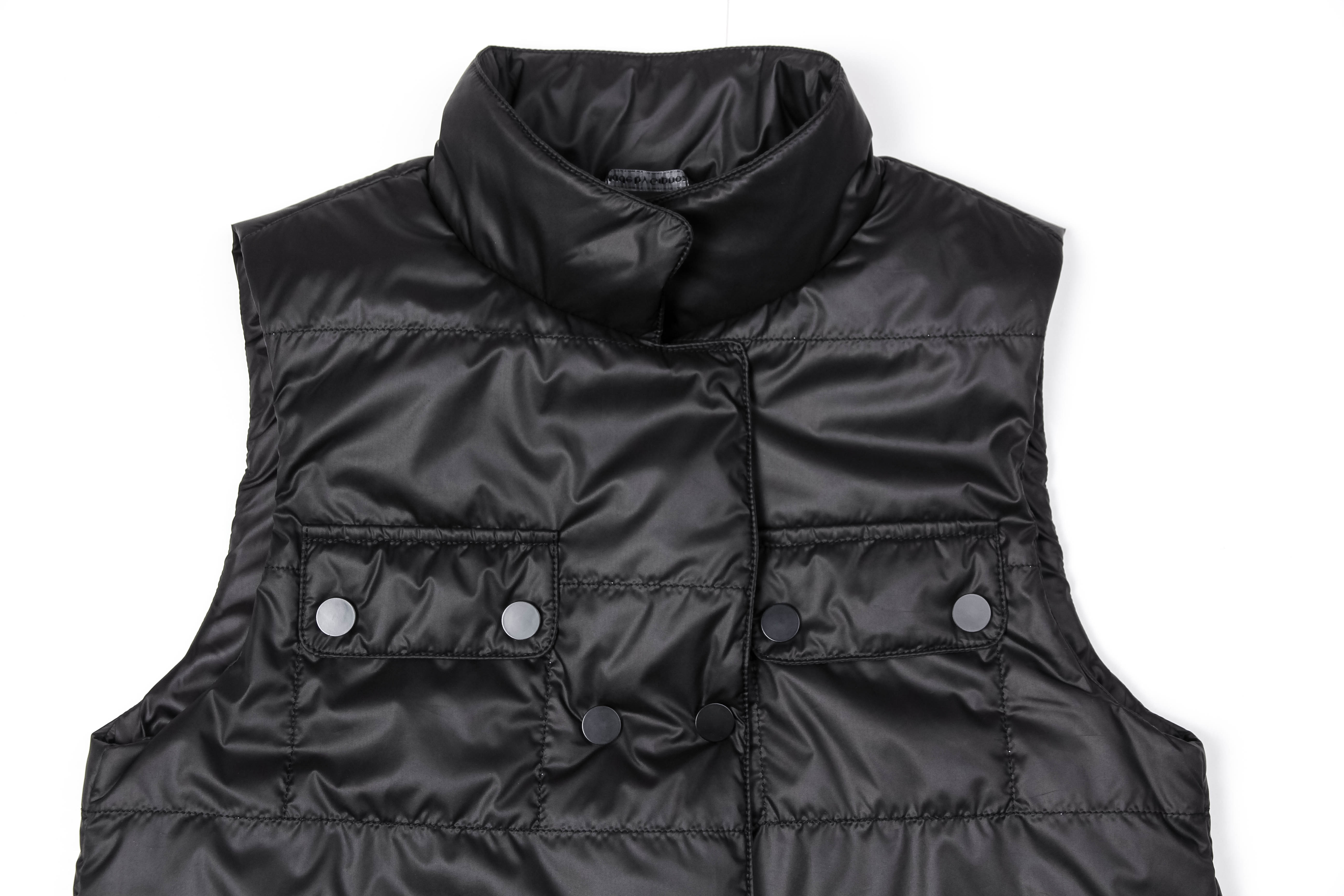 Легкий весенний жилет всегда впишется в ваш гардероб модницы! Он отлично смотрится с любой повседневной одеждой в стиле «Кэжуал». Линия талии регулируется кулисой, удобные карманы, комфортная длина. Воротник – отложной с лацканами, может превратиться в стойку, т.к. предусмотрена внутренняя застежка-магнит. Двойной ряд кнопок по краю борта смотрится оригинально, а также позволяет регулировать объем изделия. Утеплитель - термофин, плотность 100. черный