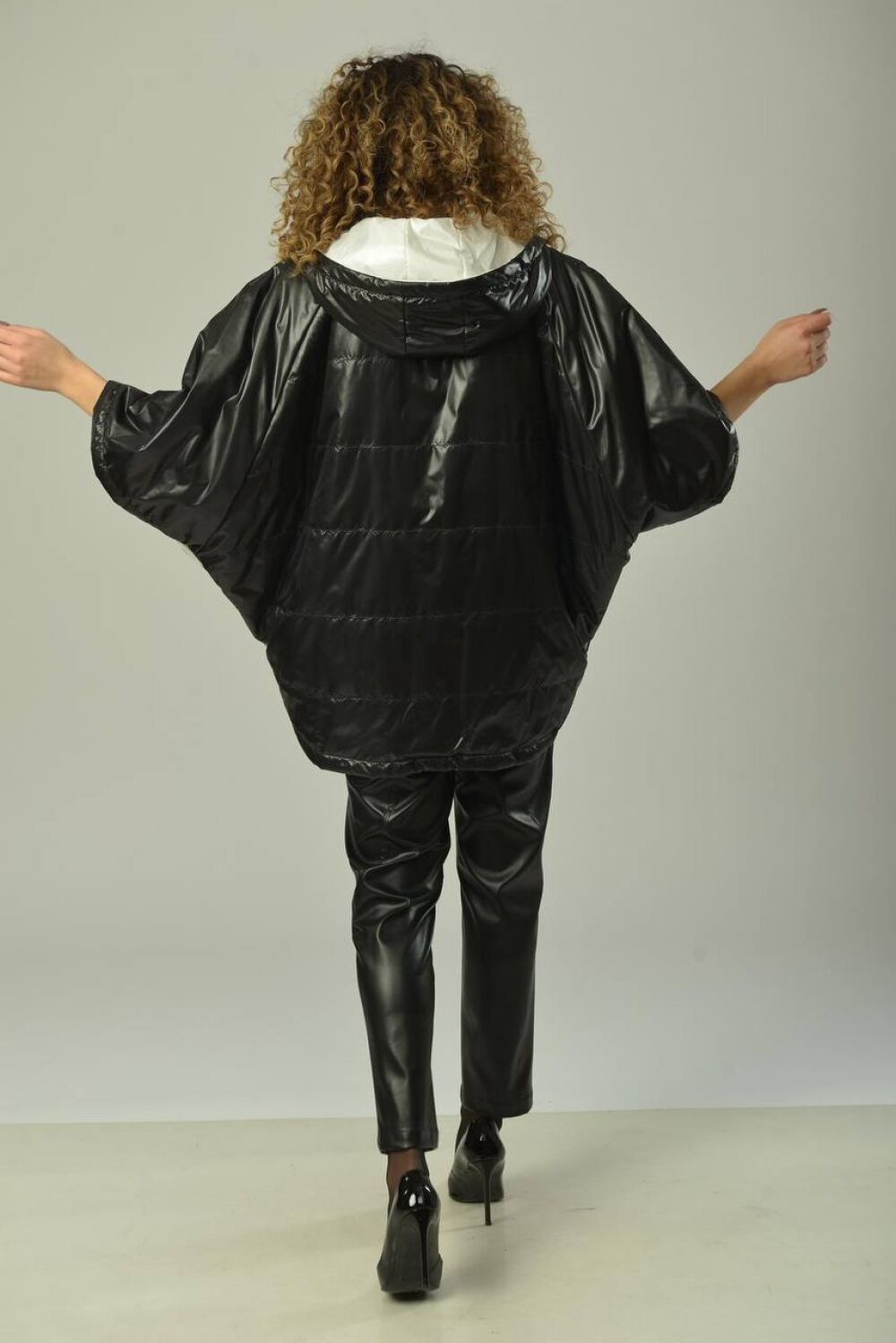 Пончо 2-ух стороннее с центральной бортовой застежкой "молния". Черная сторона: по переду и спинке выполнена горизонтальная стежка. Перед с накладными карманами "кенгуру". Вторая сторона: перед с боковыми прорезными карманами "с листочкой". По боковым швам застежка на три кнопки образует разрезы округлой формы. Воротник-капюшон. По краю отделочная строчка на 2,5 см.