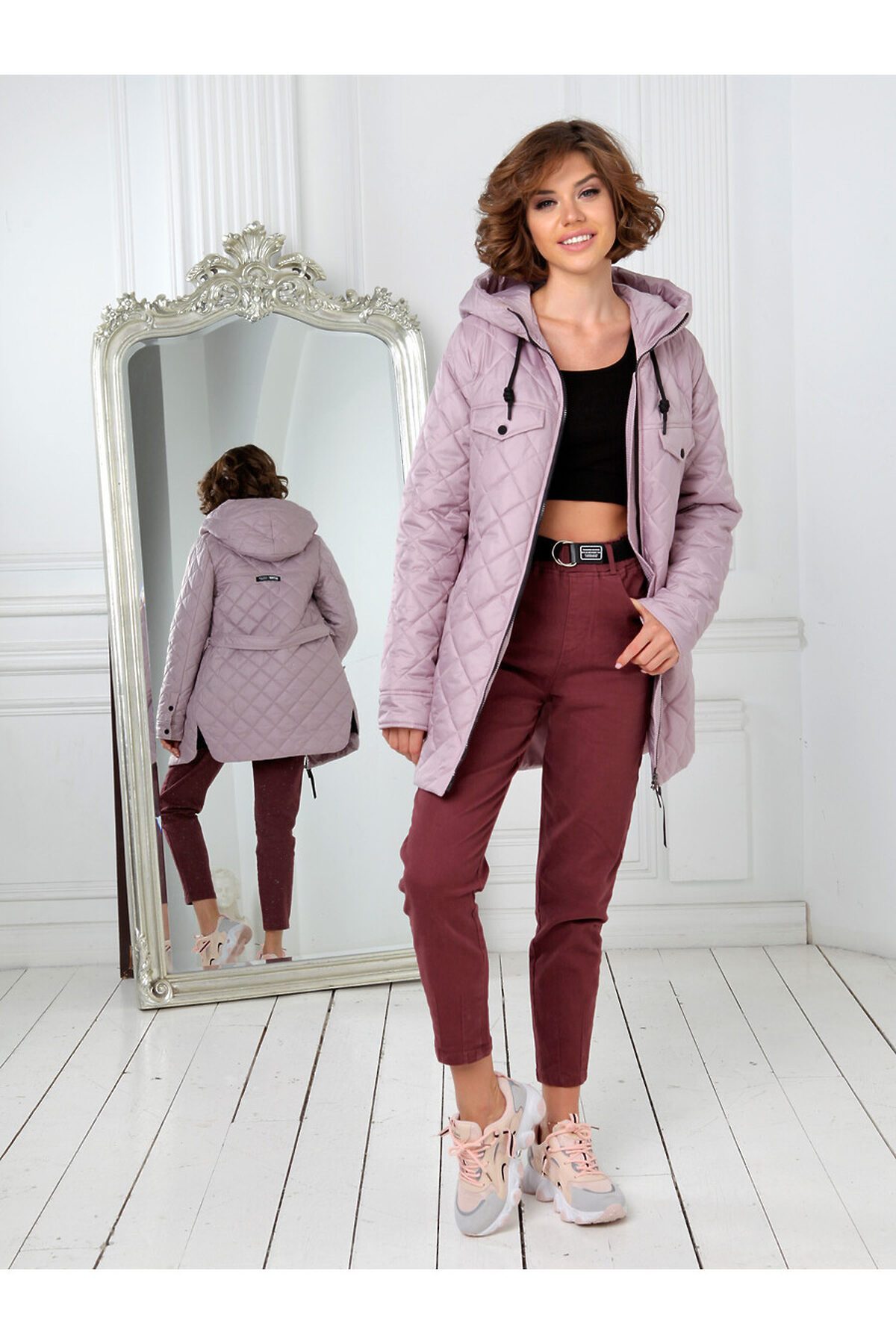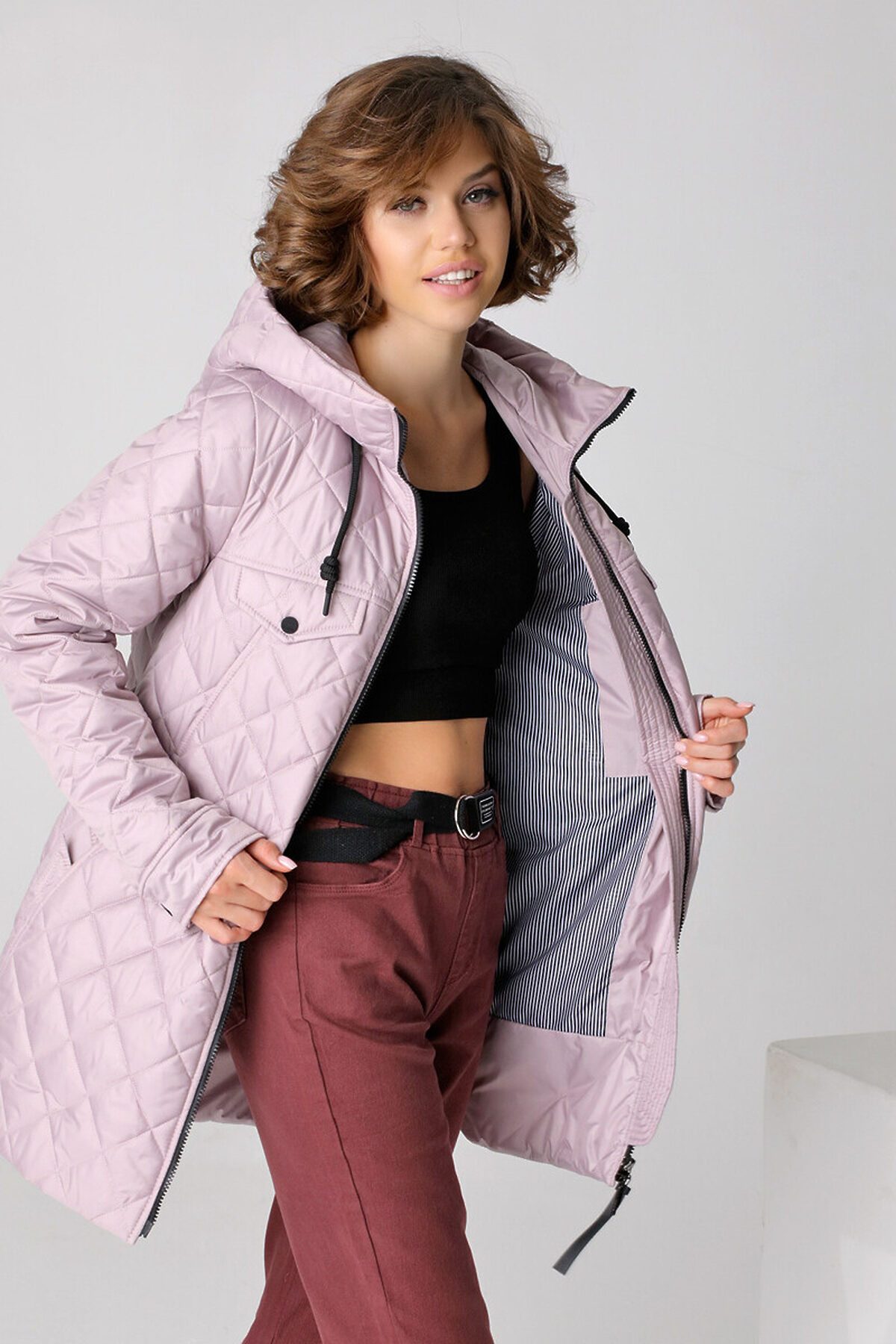 Модная куртка-рубашка прямого силуэта с втачными рукавами и застежкой на двухзамковую молнию подойдет для девушек и женщин любого возраста. Воротник - стойка, переходящая в регулируемый капюшон. Две пары прорезных карманов на кнопках удобно расположены в рельефных швах. Есть внутренний карман на молнии. Прямой силуэт этой стильной удлиненной осенне-весенней куртки можно изменить, подчеркнув линию талии завязывающимся поясом. Плащевая ткань имеет водоотталкивающую пропитку, которая выдержит небольшой осенний дождь, снег и ветер. Хорошо зарекомендовавший себя утеплитель Холлофайбер плотностью 150 гр/м защитит от холода и ветра. Подкладка в изделии выполнена из ткани в мелкую полоску.
