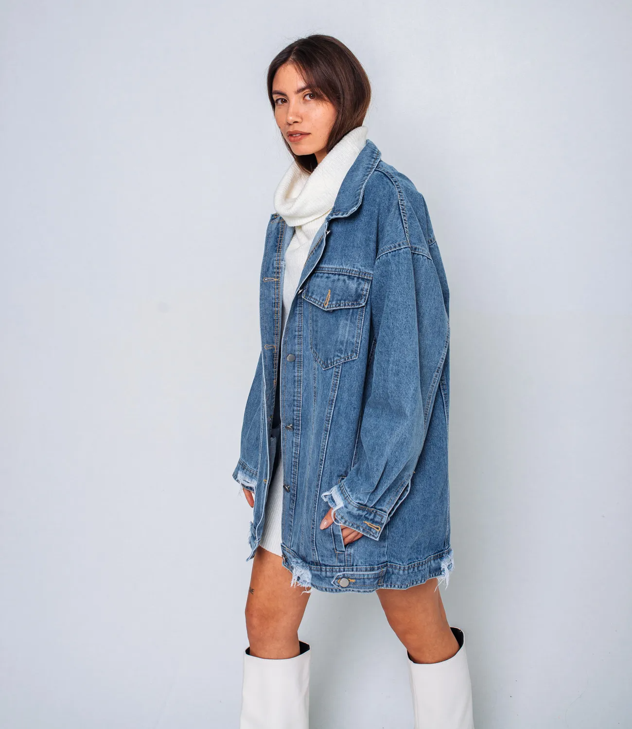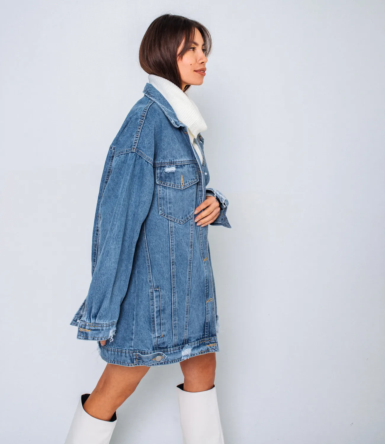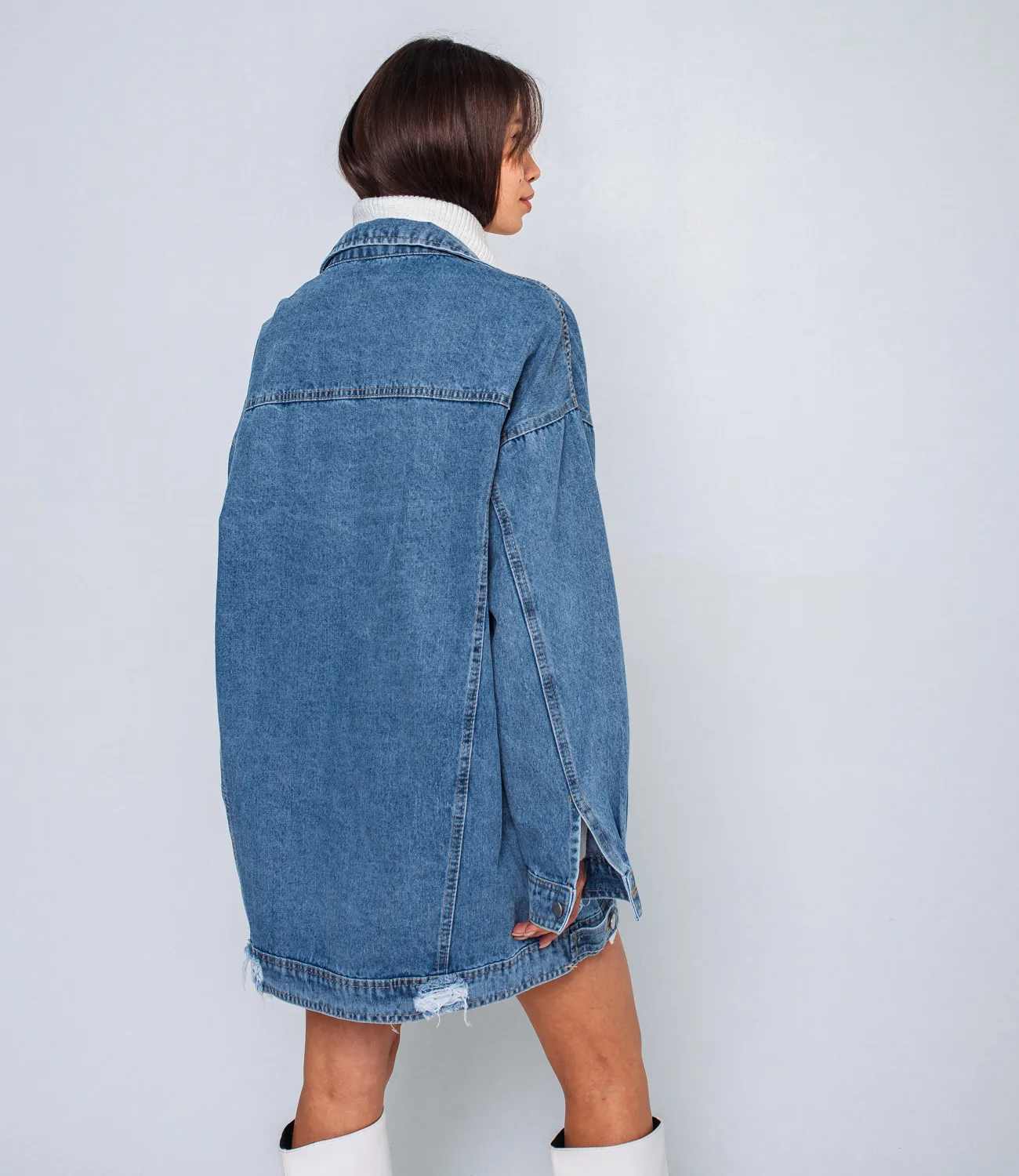 Модная джинсовая куртка свободного кроя отлично подойдет для создания casual образа. Ее можно сочетать практически с любой одеждой. Изделие изготовлено из высококачественной джинсовой ткани, которая отличается прочностью и хорошей износостойкостью.