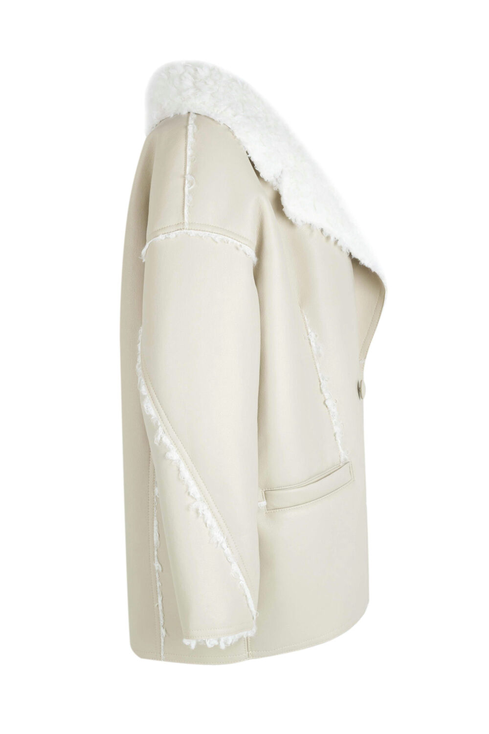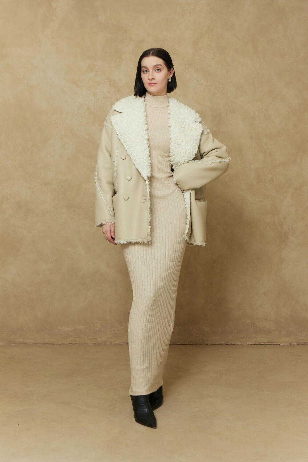 Дубленка женская прямого силуэта, двубортная, длиной до середины бедра. На переде карманы с листочкой, застежка на петли и пуговицы. Рукава длинные, двухшовные  Воротник и лацкана отложные.