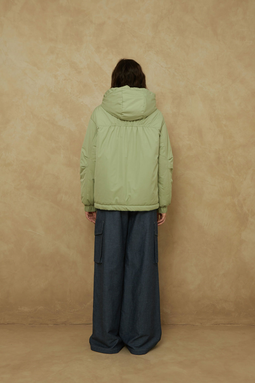 Куртка женская плащевая утепленная, прямого силуэта, длиной до середины бедра с капюшоном. Застежка переда на молнию, карманы с клапаном, пристегнутым на кнопку. Спинка собрана на сборку по шву притачивания кокетки. Рукава длинные, низ собран на резинку. По низу изделия и отлету капюшона кулиска.