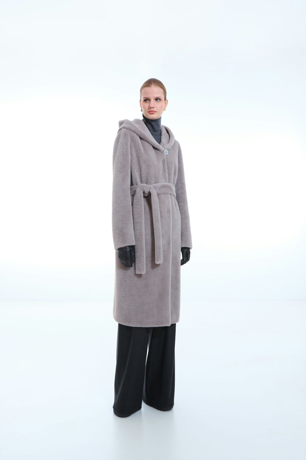 Пальто женское демисезонное, однобортное, прямого силуэта длиной ниже колена, на подкладке. Застежка на пришивные кнопки. Перед с функциональными карма-нами в рельефных швах. Рукав длинный, двухшовный. Пальто с капюшоном и съемным поясом