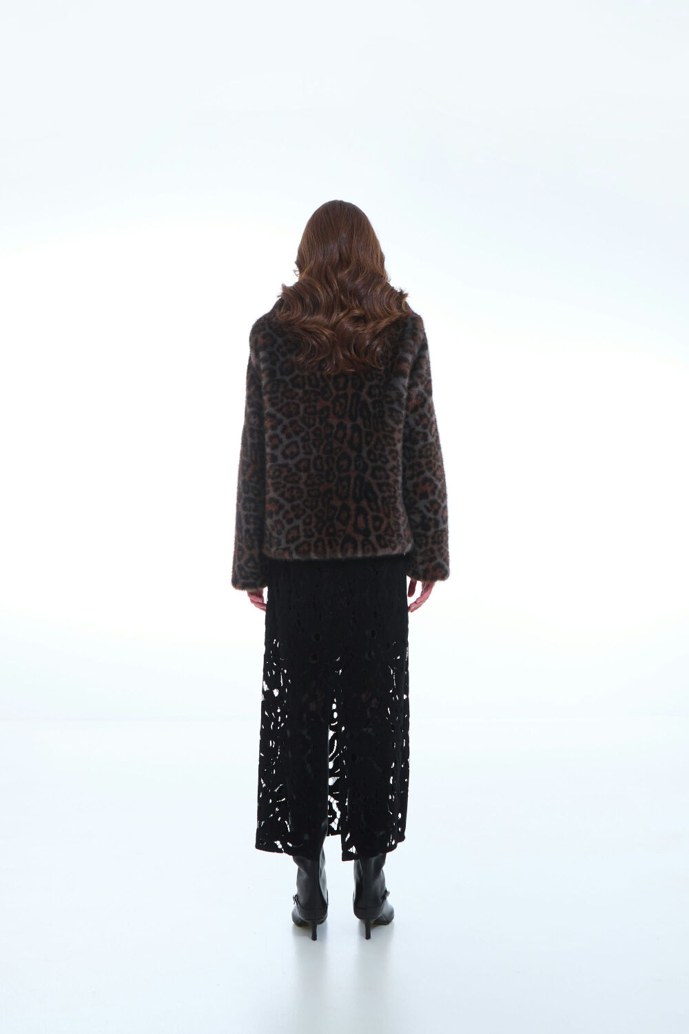 Пальто женское демисезонное, из мехового трикотажного полотна, на подкладке, однобортное, прямого силуэта длиной до середины бедра. Застежка на пришивные кнопки. Перед с функциональными карманами «щель». Рукав длинный, одношовный. Воротник и лацкана отложные.