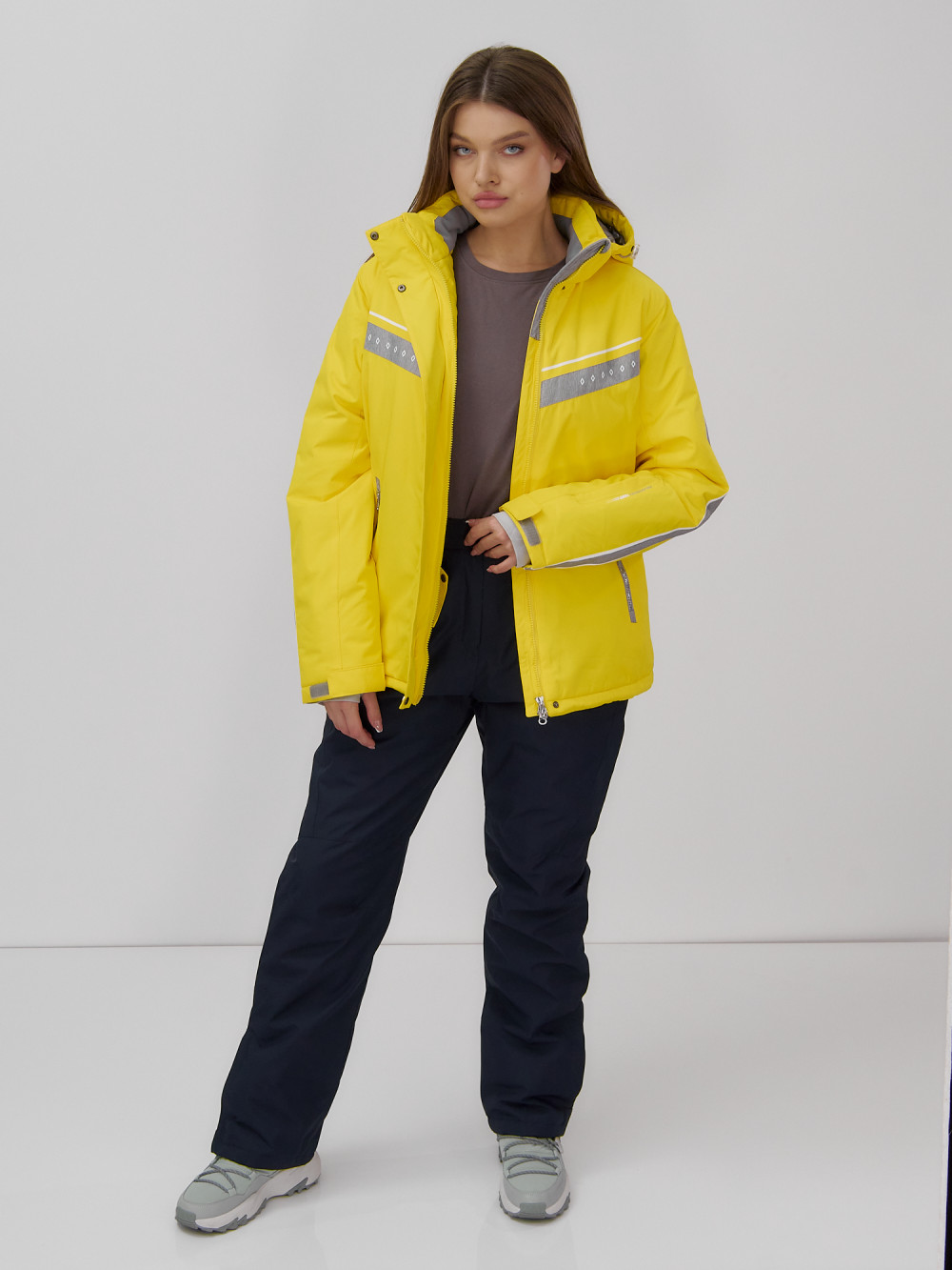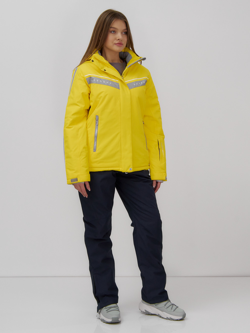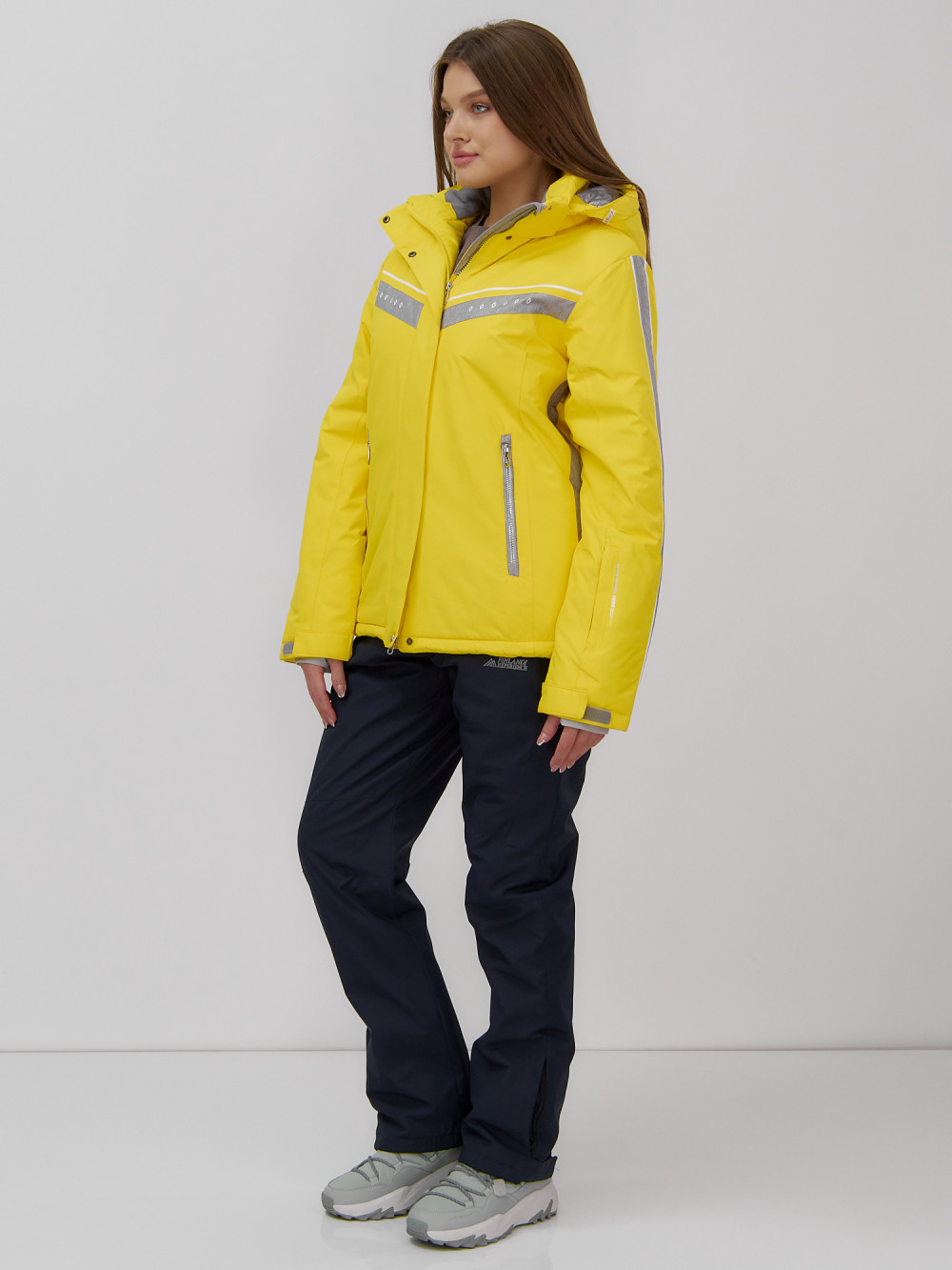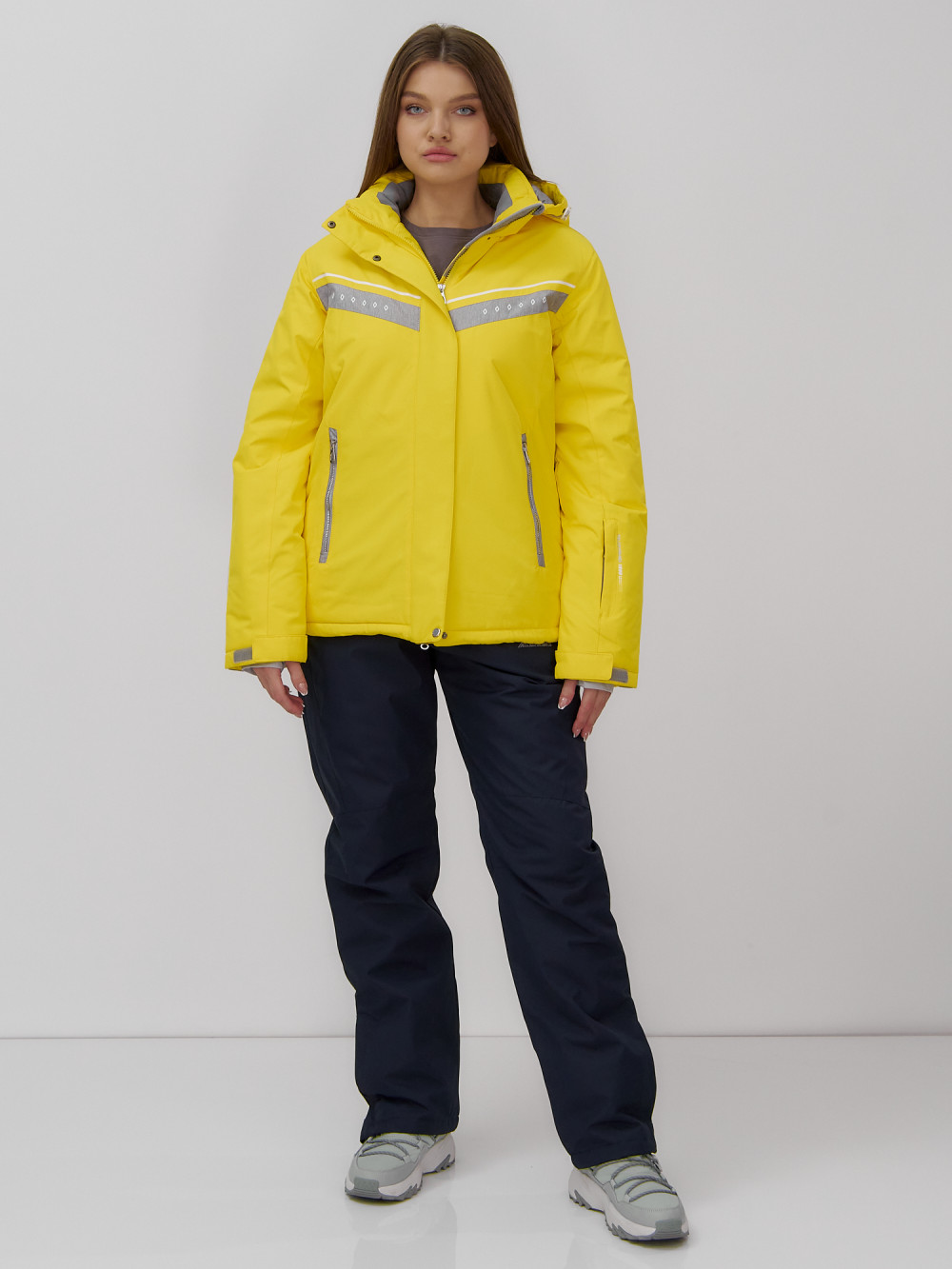 Однотонная куртка с контрастными вставками на рукавах и груди выглядит оригинально и стильно, что делает этот комплект не только практичным, но и модным выбором для зимнего отдыха.