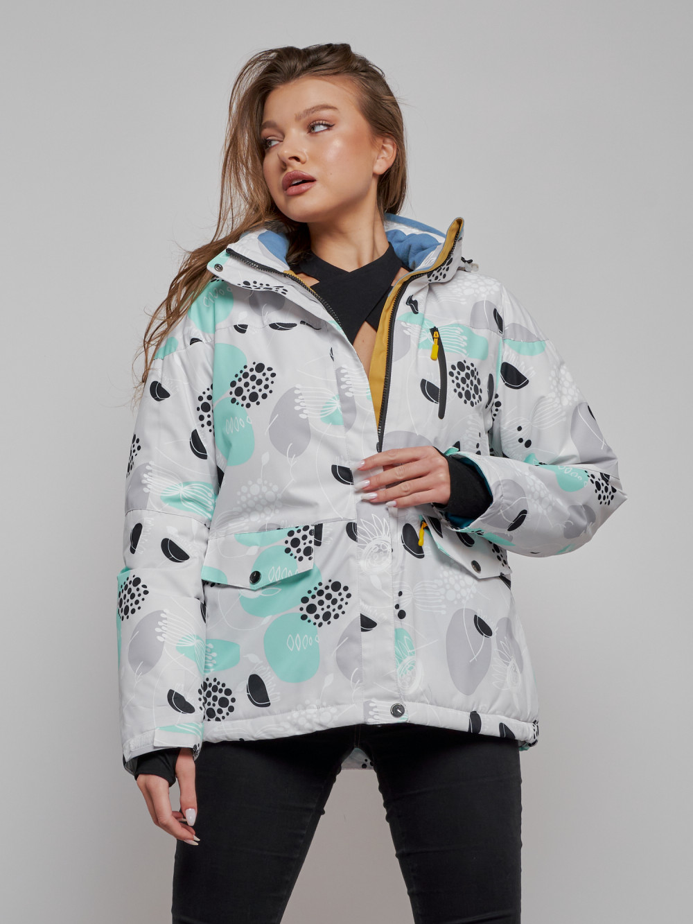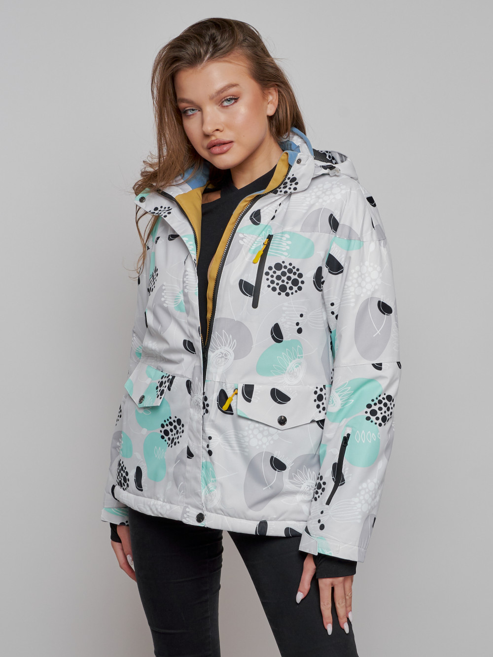 Горнолыжная куртка женская зимняя серого цвета 2302-1Sr