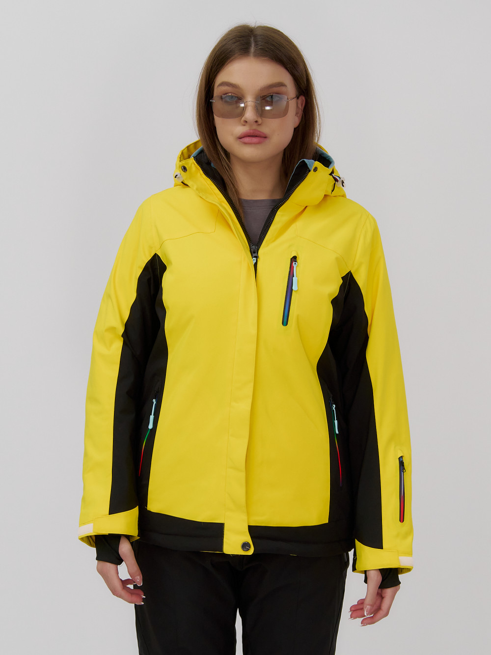 Горнолыжная куртка женская зимняя желтого цвета 027J