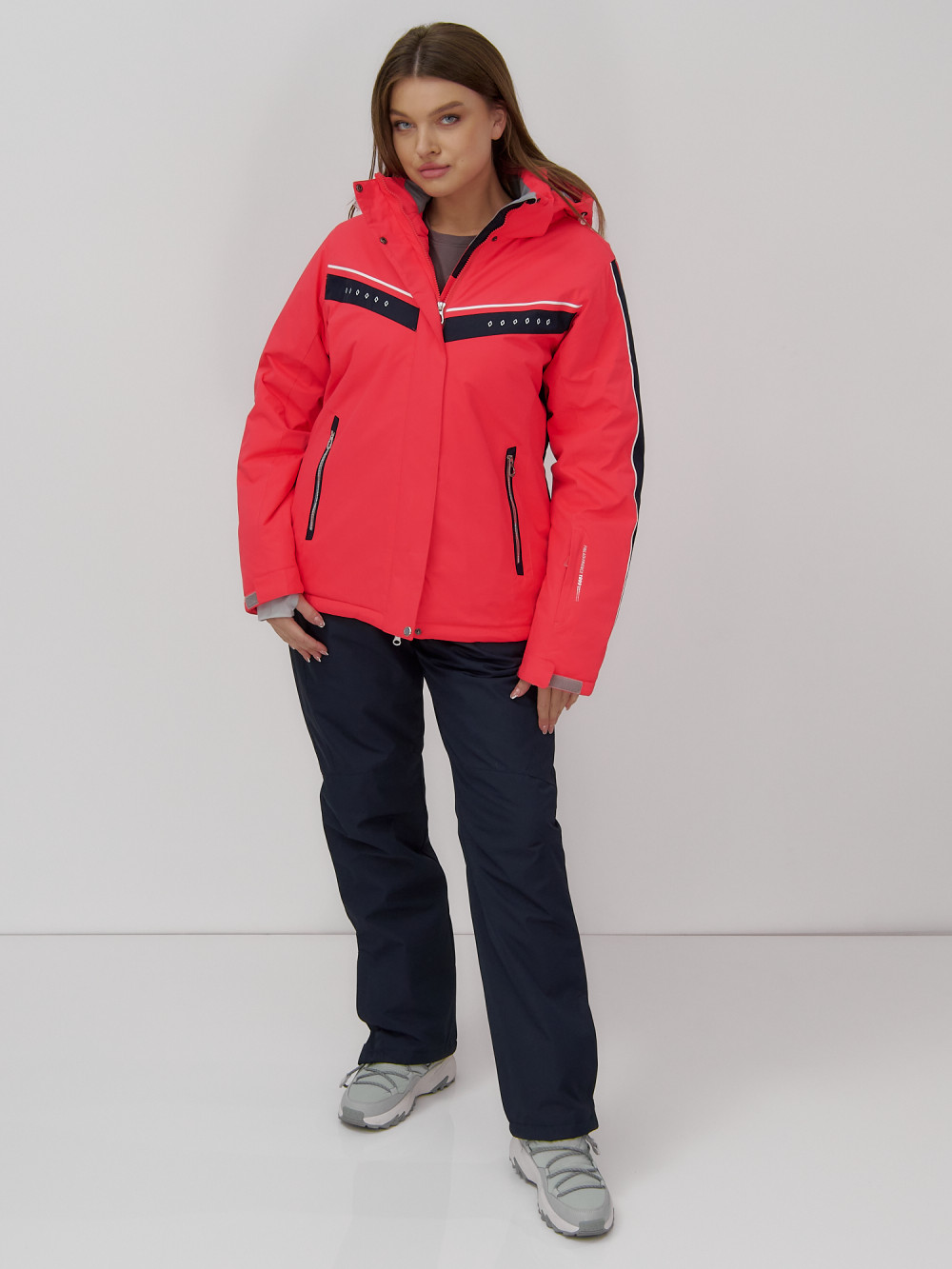 Однотонная куртка с контрастными вставками на рукавах и груди выглядит оригинально и стильно, что делает этот комплект не только практичным, но и модным выбором для зимнего отдыха.