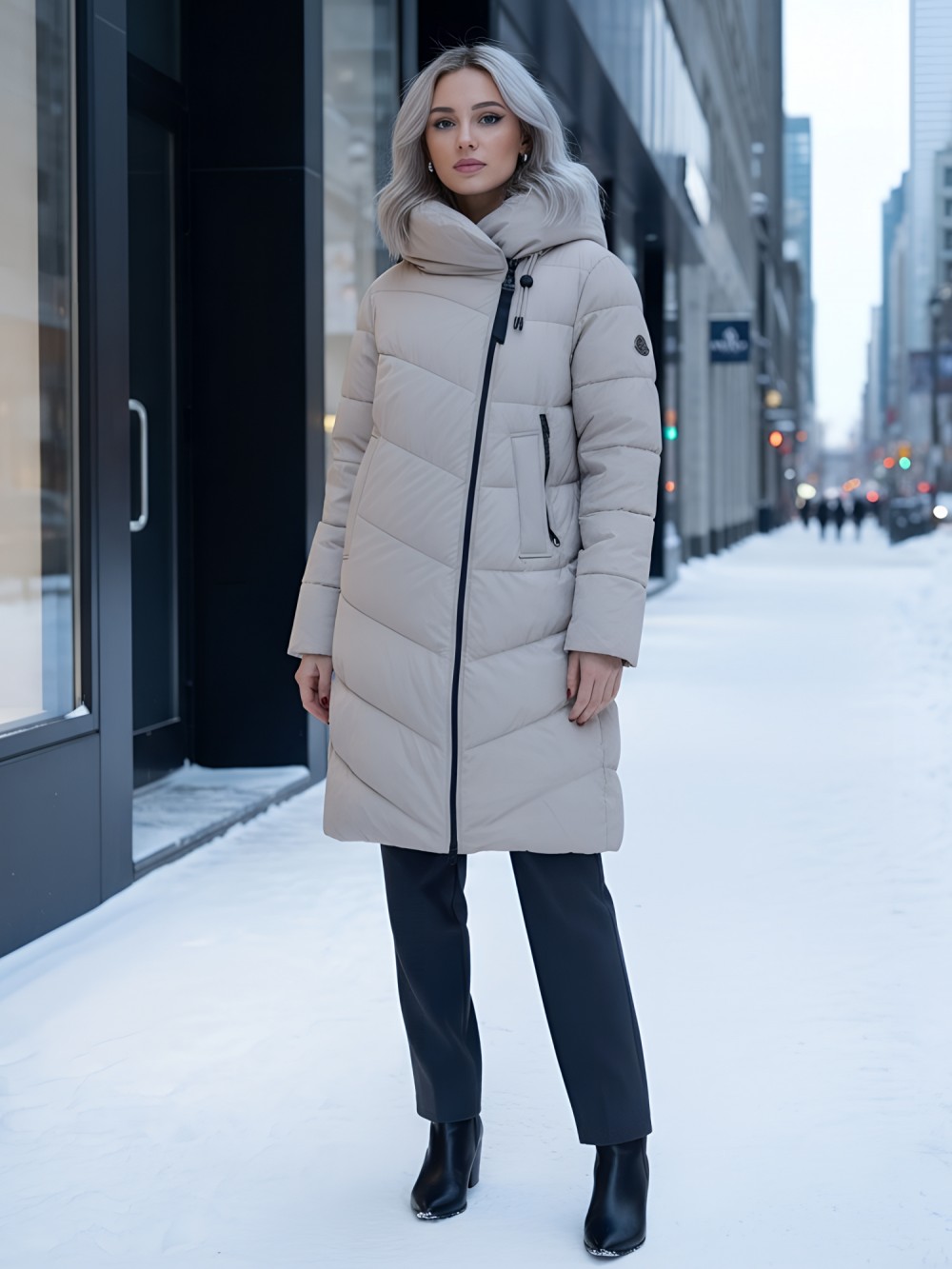 Капюшон не съемный и оснащен фиксатором, а внутренние карманы добавляют удобства. Двойная молния служит надежной застежкой, а проклеенные и прошитые внутренние швы усиливают защиту от ветра. Модель отличается элегантным офисным и повседневным стилем, а гладкая стеганая фактура материала придает ей современный вид.