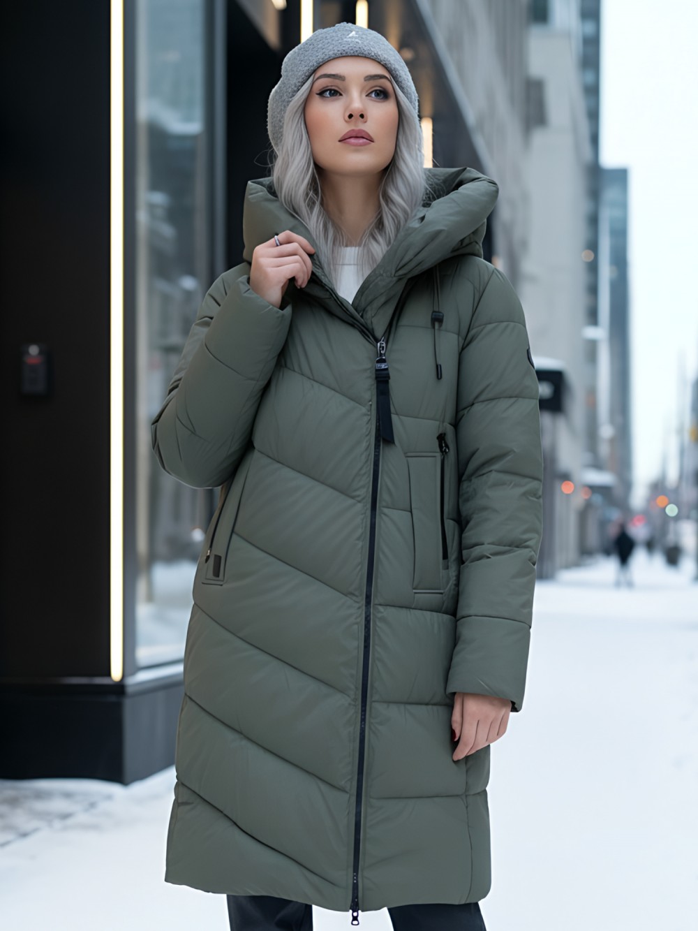 Капюшон не съемный и оснащен фиксатором, а внутренние карманы добавляют удобства. Двойная молния служит надежной застежкой, а проклеенные и прошитые внутренние швы усиливают защиту от ветра. Модель отличается элегантным офисным и повседневным стилем, а гладкая стеганая фактура материала придает ей современный вид.