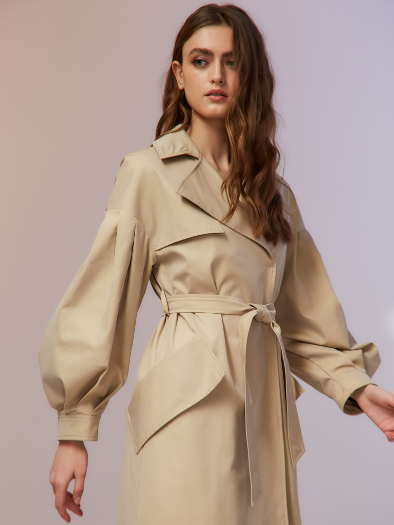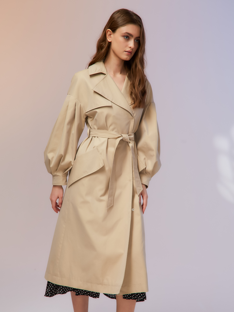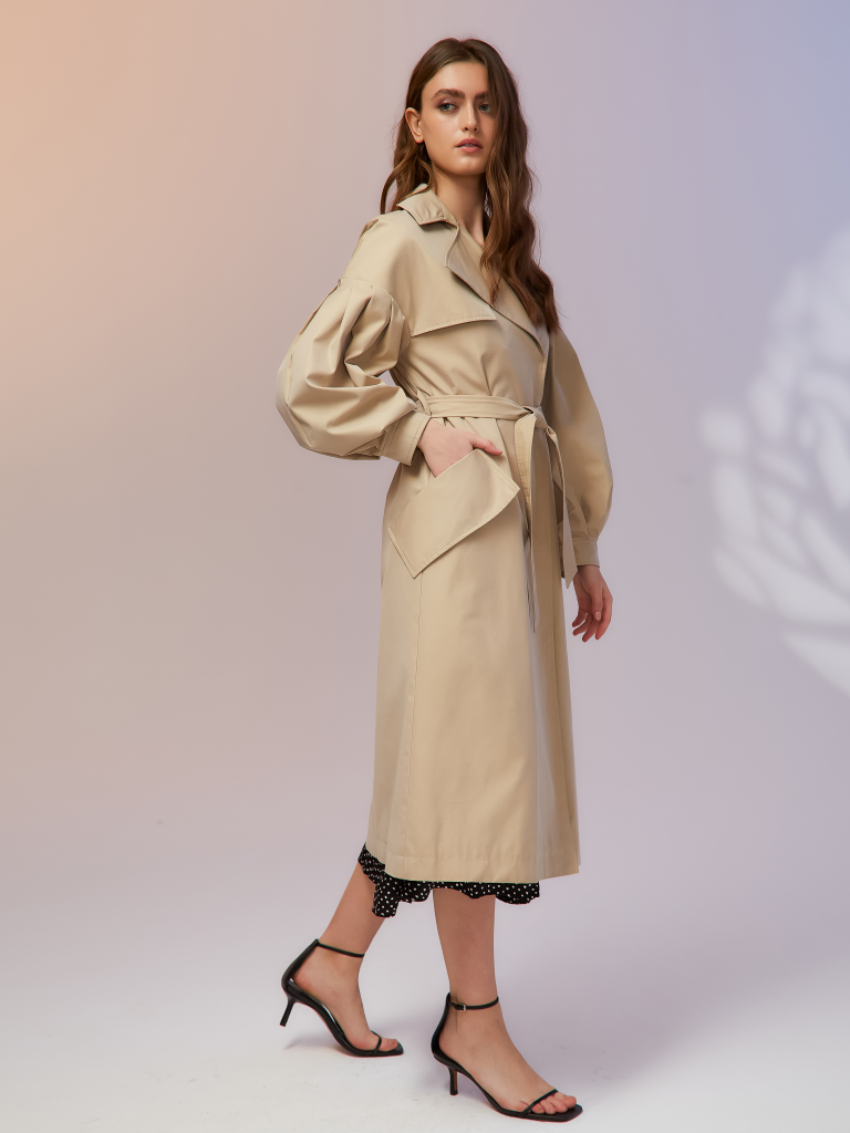 Женский плащ свободного кроя. Акцентные рукава со складками и со спущенной линией плеча, низ оформлен манжетой. Горловина оформлена английским воротником, имеются два кармана с листочкой, застежка на потайных кнопках. В изделии имеется внутренний карман. В комплекте прилагается пояс из основной ткани. Ткань изделия хлопкосодержащая обработана качественной водоотталкивающей пропиткой. Изделие без утепления, рекомендуемый температурный режим от +17°C до +23°C. Длина изделия: 120 см. Длина рукава: 64 см. Размеры: 42 - 54. Цвета: светло-бежевый / черный.