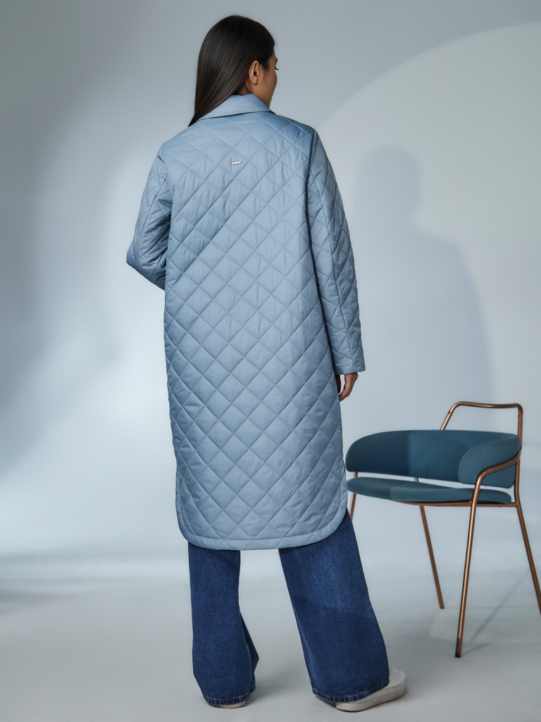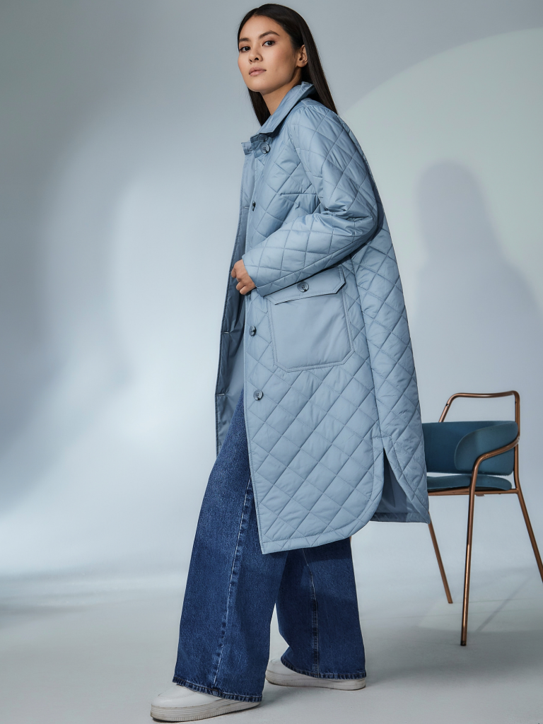 Утепленный плащ-рубашка прямого силуэта с втачным рукавом. В модели имеются два функциональных накладных кармана с клапанами на пуговицах, а также один внутренний карман. Ткань - плащевая с водоотталкивающей пропиткой, расстеганная ромбом. Утепление нового поколения ORSOTHERM 100 гр. Рекомендуемый температурный режим от +10°C до +18°C. Длина изделия: 110 см. Длина рукава: 64 см. Размеры: 42-56.