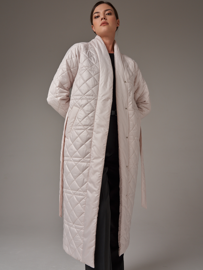 Стеганый плащ-кимоно прямого силуэта. Рукав реглан с заниженной проймой. Застежка на потайные кнопки. В изделии два кармана, оформленных листочками на потайных кнопках и один внутренний карман. В комплекте с плащом идет пояс из основной ткани. Ткань плащевая с водоотталкивающей пропиткой, простеганная ромбом. Утепление нового поколения ORSOTHERM 100 г/м2. Рекомендуемый температурный режим(от +10°C до +18°C). Длина изделия -120 см. Длина рукава - 64 см.