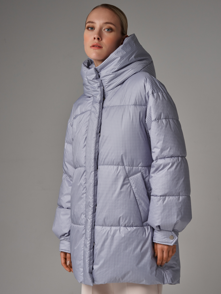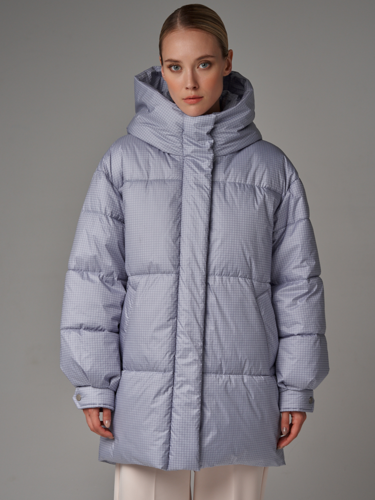 Пуховик oversize силуэта. В изделии есть внутренняя утяжка по низу. Рукав со спущенным плечом. По низу рукавов заложены складки и имеются манжеты с отделочными кнопками. Застежка на молнию, скрытую под планкой на потайных кнопках. В изделии имеются два функциональных кармана с листочками на магнитах и один внутренний карман. Ткань - плащевая с водоотталкивающей пропиткой. Утепление - Био-пух, 200 гр. Рекомендуемый температурный режим (от 0°C до -15°C). Длина изделия - 85 см. Длина рукава - 64 см.