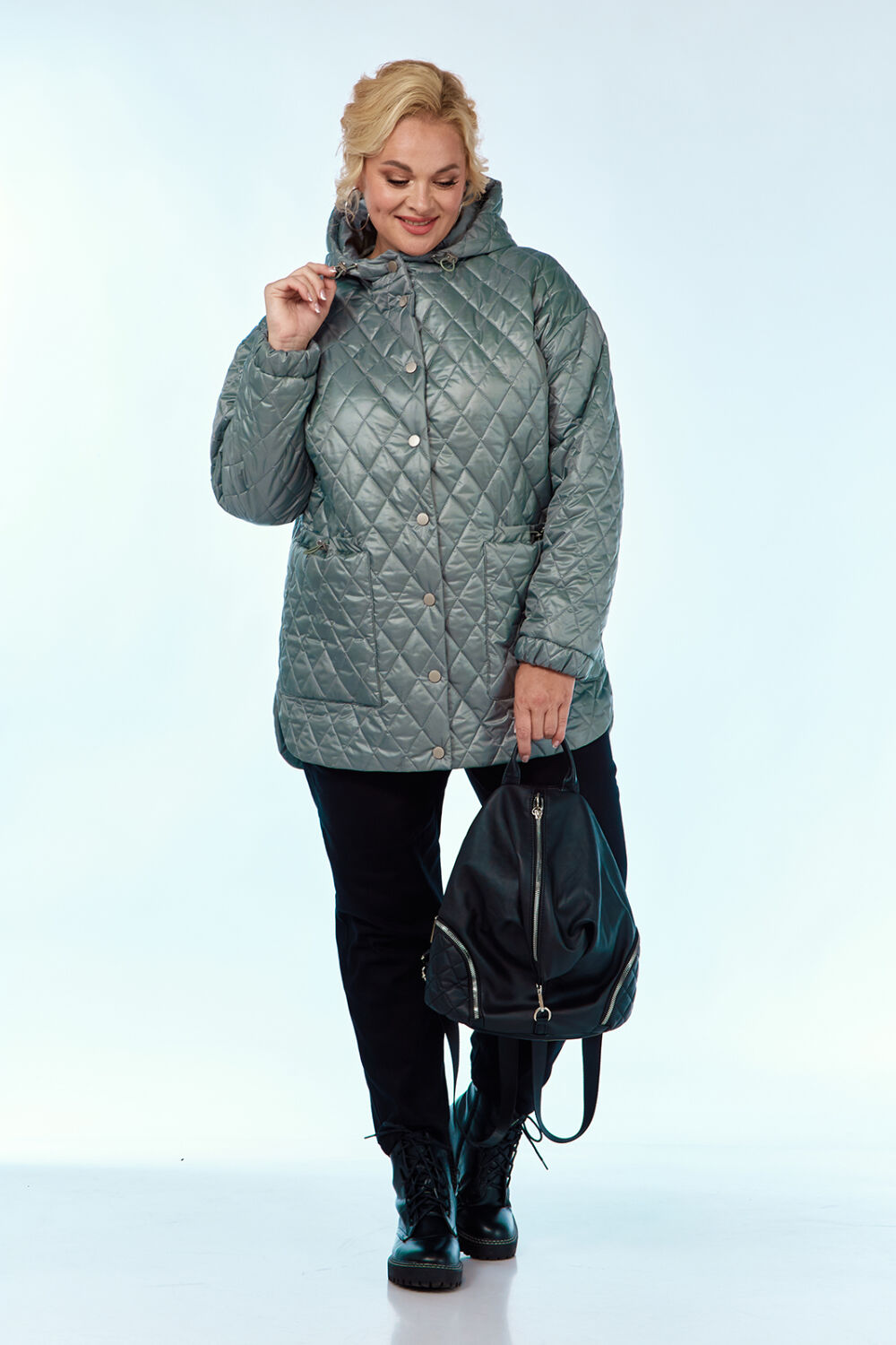 Куртка женская изготовлена из стеганой курточной ткани на синтепоне. Горловина оформлена капюшоном на стойке, с кулисой и втянутым шнуром с фиксатором. По переду обработаны двойные накладные карманы. Спинка цельнокроеная. Застежка на кнопки. Рукава спущенные, по низу рукава обработаны манжеты с резинкой. Низ в изделии фигурный. Температурный режим до -5.