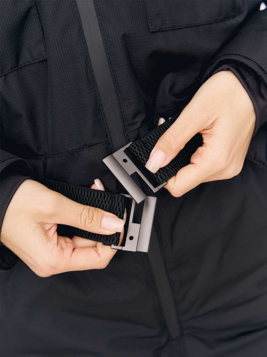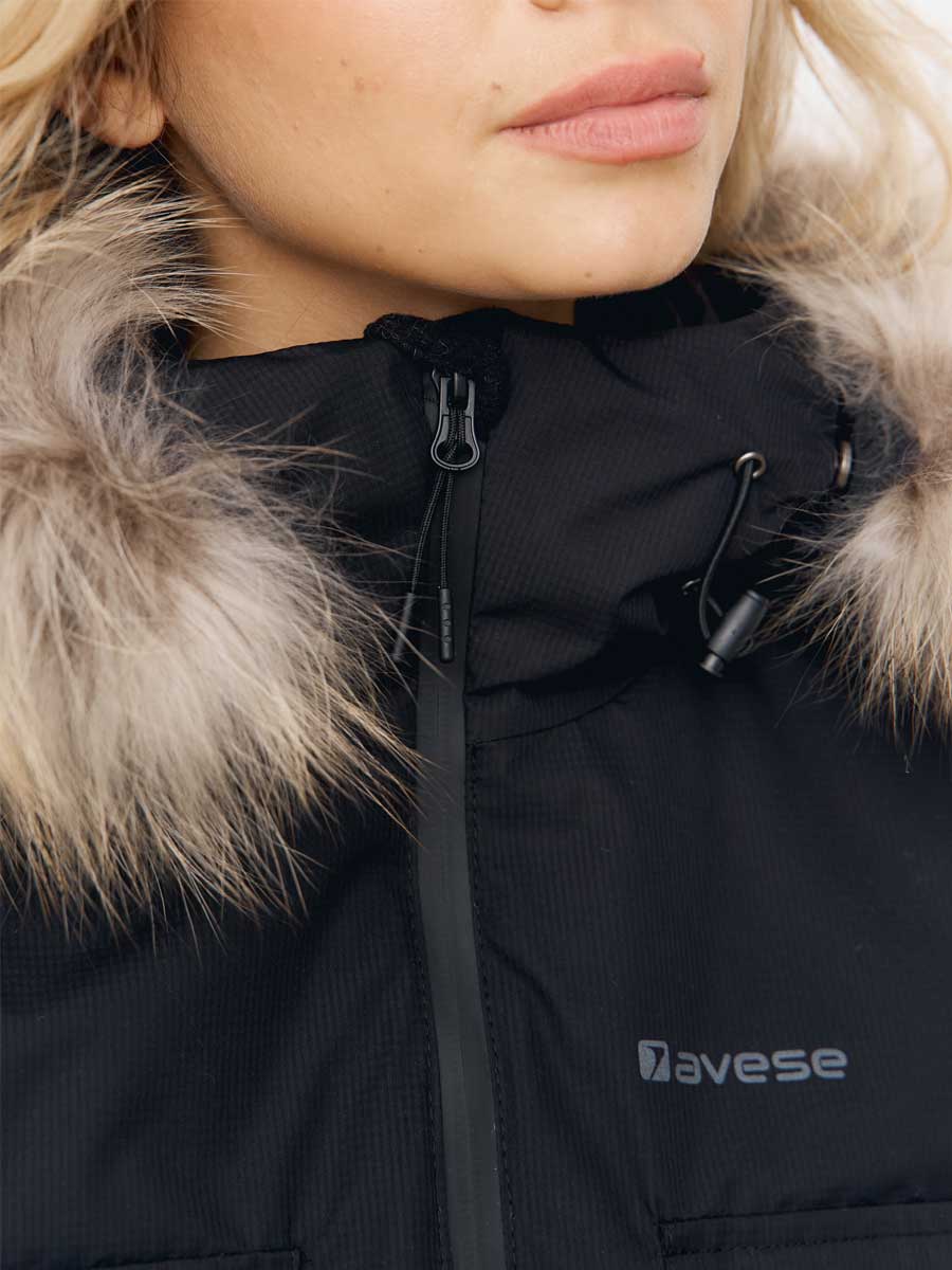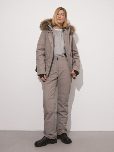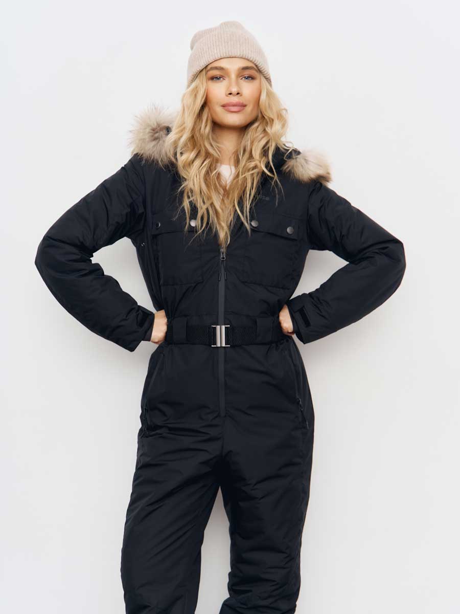 Женский зимний комбинезон из мембранной ткани с отрезным поясом по талии, в паты вставлен декоративный ремень из эластичной резины с пряжкой. Центральная застежка на молнию с влагозащитным покрытием. Втачной капюшон с отстегивающейся опушкой из натурального меха - енот. 2 кармана на молниях с влагозащитной обработкой. 2 верхних накладных кармана с клапаном на кнопках. 1 карман на рукаве с молнией. Низ рукава с патами на липучке и с внутренним манжетом, манжет с отверстием для большого пальца. Низ брюк с усилением и с внутренней снегозащитной муфтой. Комбинированная подкладка из флиса и шелка с внутренним карманом. Внутри комбинезона помочи из резинки для удобства ношения. Рассчитана на температуру от 0 до -20.