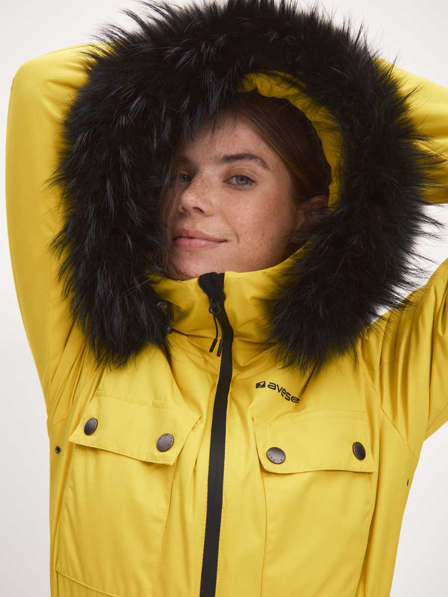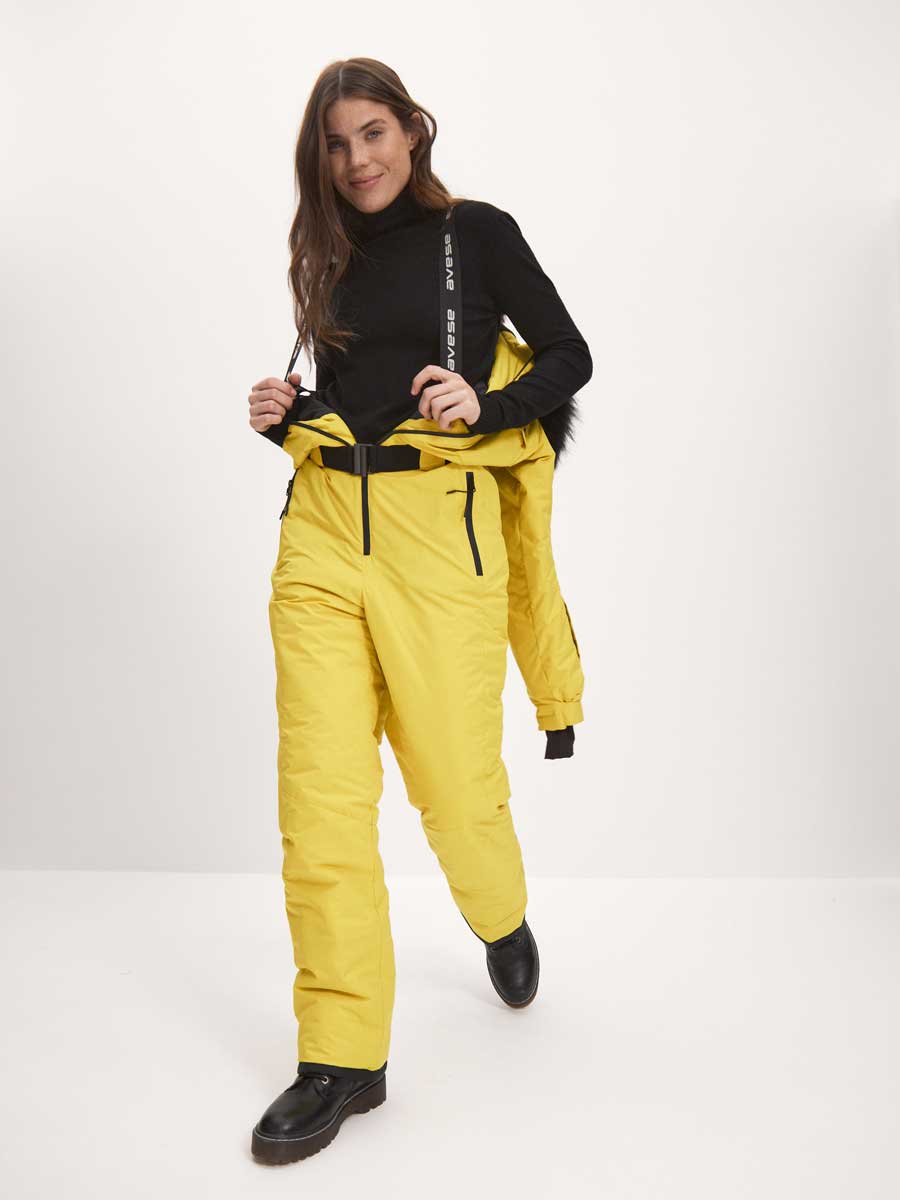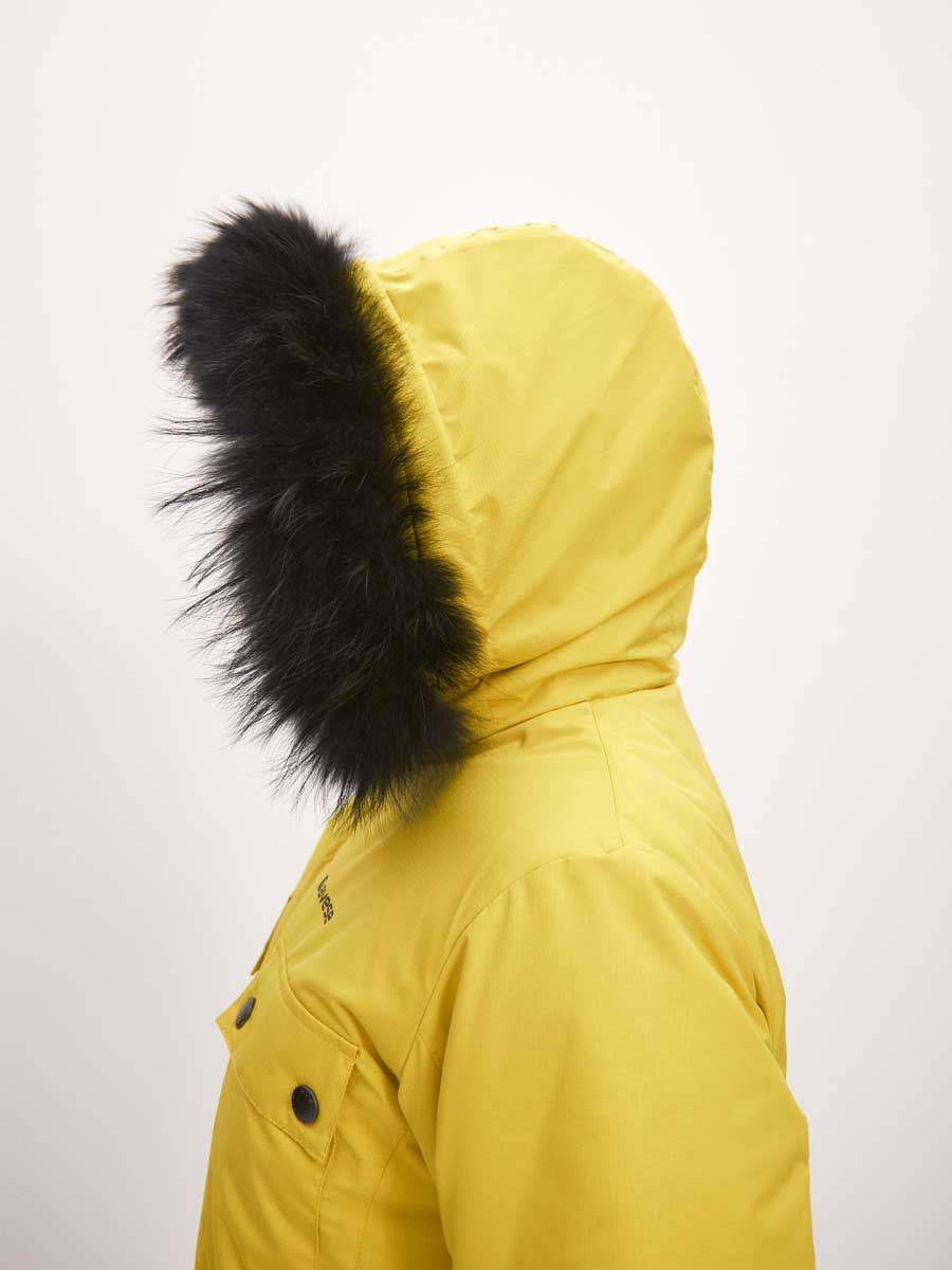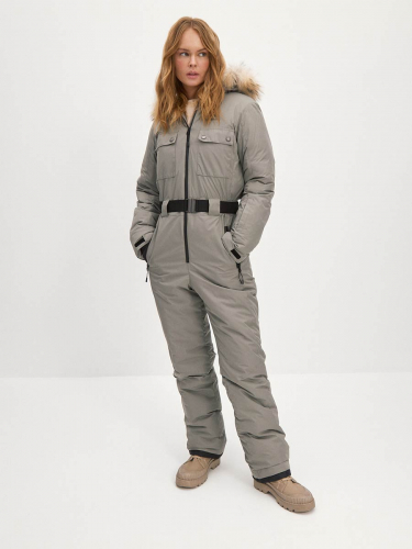 Женский зимний комбинезон из мембранной ткани с отрезным поясом по талии, в паты вставлен декоративный ремень из эластичной резины с пряжкой. Центральная застежка на молнию с влагозащитным покрытием. Втачной капюшон с отстегивающейся опушкой из натурального меха - енот. 2 кармана на молниях с влагозащитной обработкой. 2 верхних накладных кармана с клапаном на кнопках. 1 карман на рукаве с молнией. Низ рукава с патами на липучке и с внутренним манжетом, манжет с отверстием для большого пальца. Низ брюк с усилением и с внутренней снегозащитной муфтой. Комбинированная подкладка из флиса и шелка с внутренним карманом. Внутри комбинезона помочи из резинки для удобства ношения. Рассчитана на температуру от 0 до -20.
