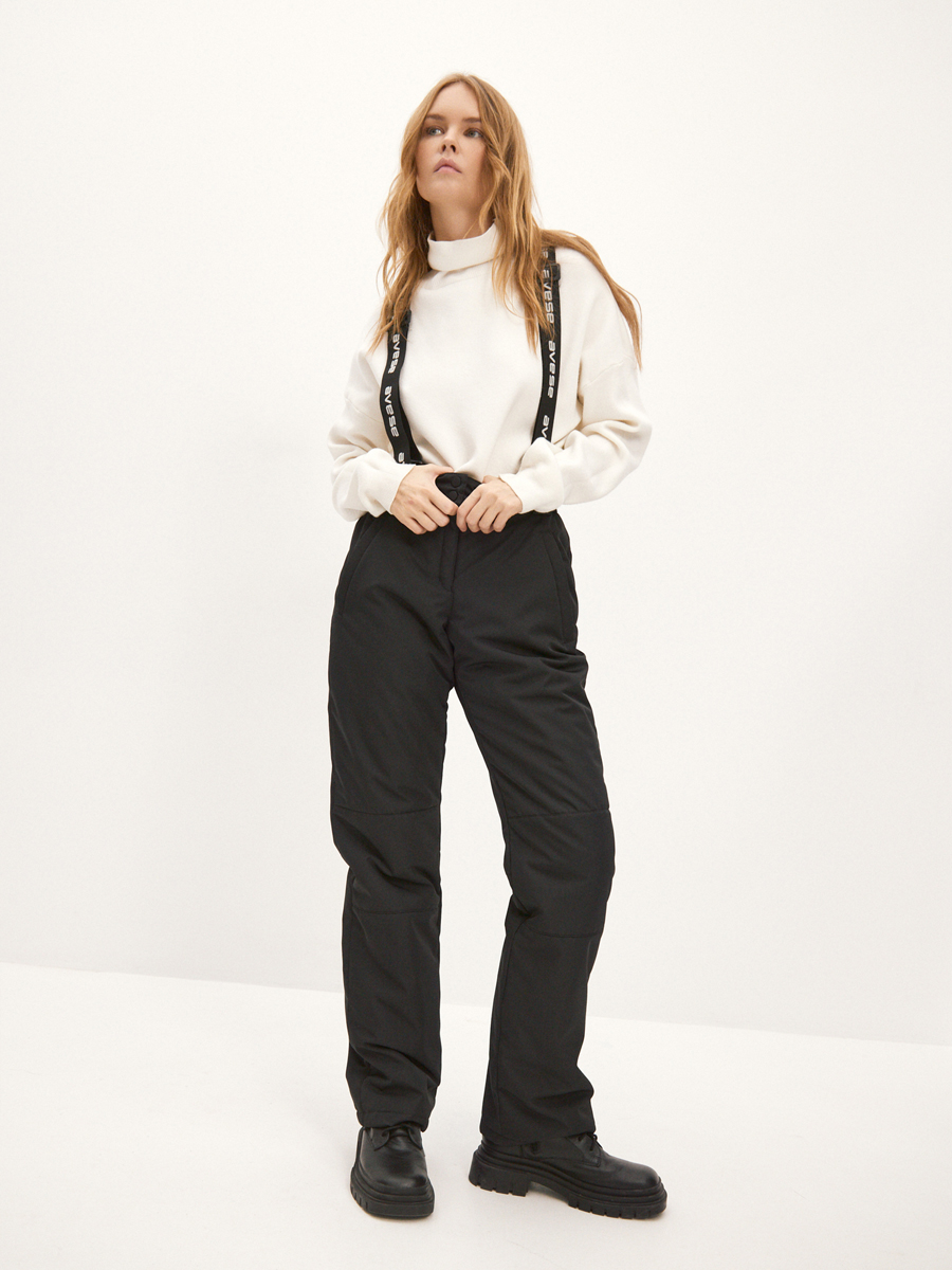 Брюки утеплённые на синтепоне с отстегивающимися бретелями и спинкой. 2 боковых прорезных кармана с листочкой на молнии. Пояс брюк с эластичной резинкой. Низ брюк прямой, со снегозащитной муфтой из непромокаемого полотна, со стопорной резинкой по низу.