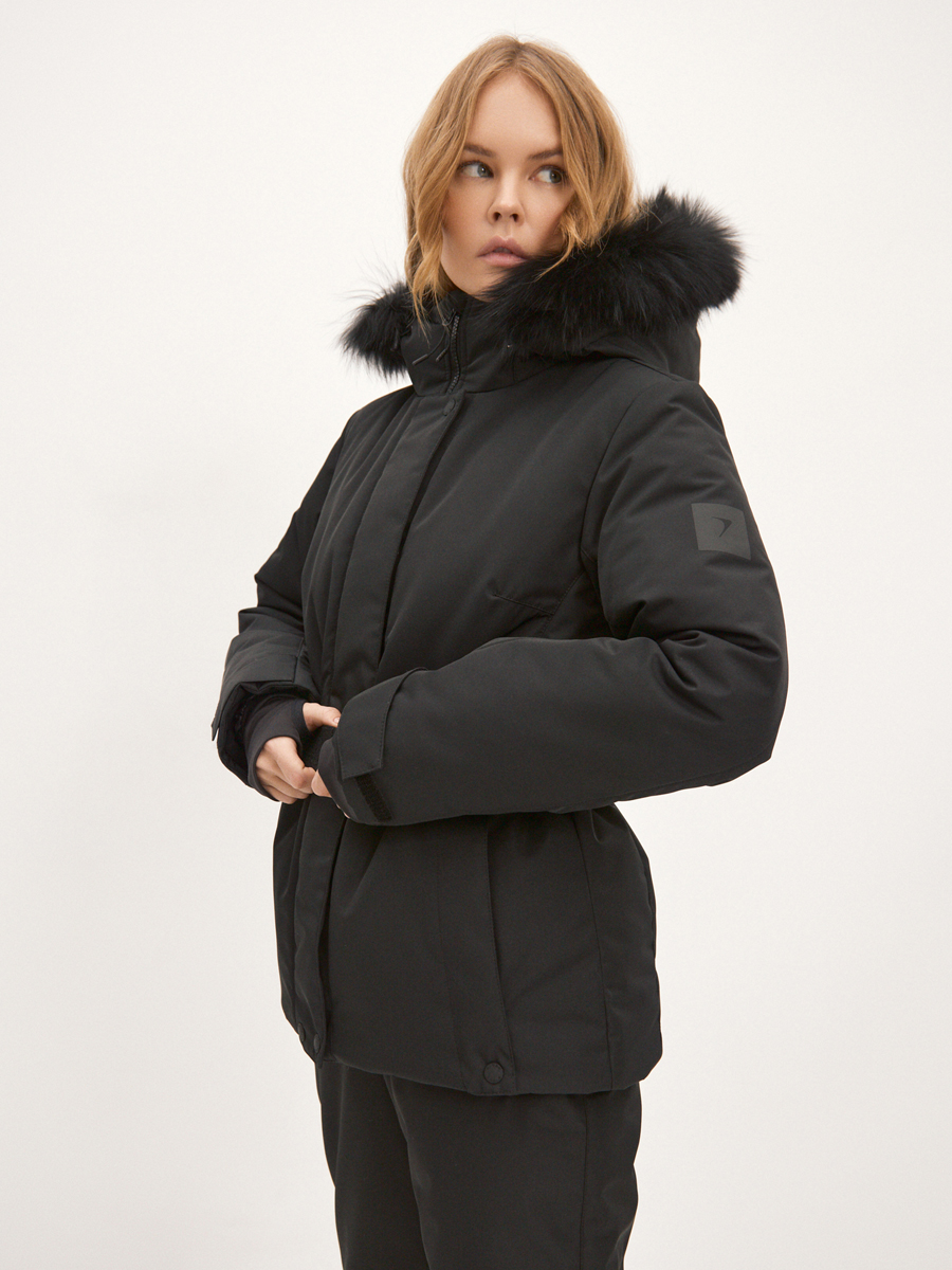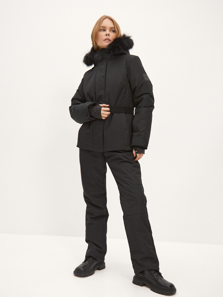 Костюм зимний женский из мембранной ткани. Куртка с втачным капюшоном. На капюшоне отстегивающаяся опушка из натурального меха - енот. Центральная застёжка на молнию, закрыта планкой на кнопках. В боковых швах куртки по талии шлевки, в которые вставлен декоративный ремень из резины с пряжкой. 2 нижних кармана с молниями и клапаном на кнопке. На рукавах паты с липучками и внутренними манжетами с отверстием для большого пальца. На левом рукаве карман с молнией. В подкладке использована ткань с фольгированными микрочастицами серебристого цвета для отражения выделяемого телом тепла и сохранения его в слое под подкладкой.