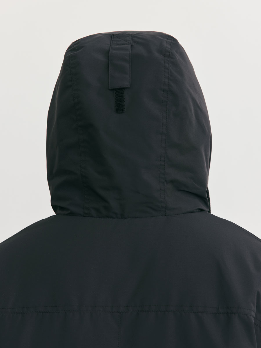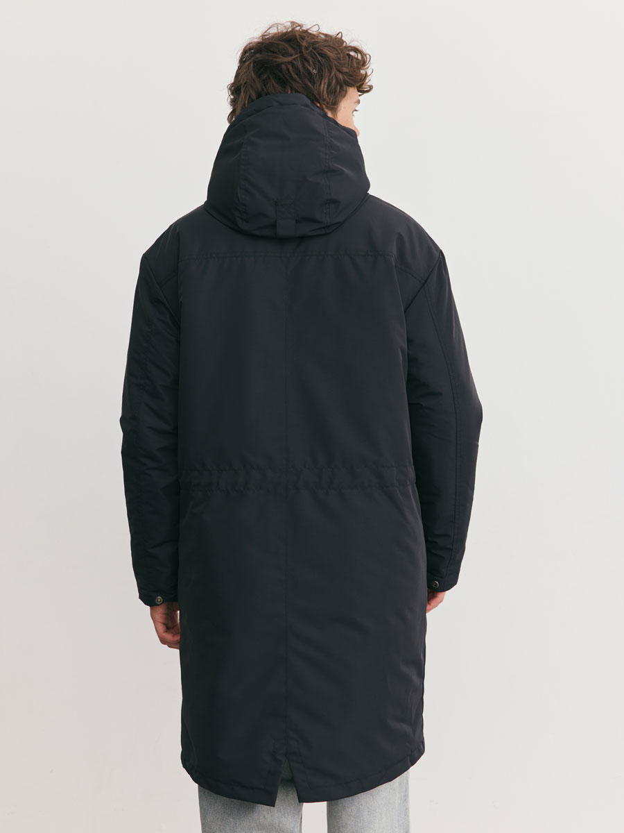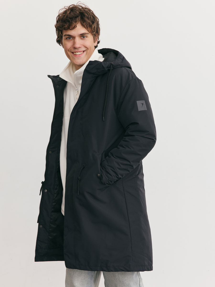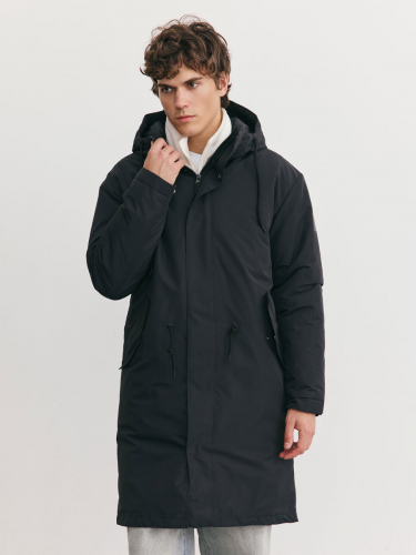 Демисезонная удлиненная куртка для мужчин, прямого силуэта, с втачным капюшоном. Центральная застёжка на молнию, закрытую планкой на потайных кнопках. В плаще по талии кулиса со шнуром. Концы шнура снаружи. На полочках 2 прорезных кармана с листочками, закрыты клапанами на кнопках. Низ куртки фигурный, с разрезом на спинке. . По низу рукава кнопки для регулировки ширины внизу. На капюшоне хлястик и липучка для регулировки глубины. По лицевому краю капюшона кулиса с люверсами и шнуром, выведенным наружу. Подкладка настегана на утеплитель. На левой подкладочной полочке – прорезной карман «в рамку» с молнией. Рассчитана на температуру от 0 до +15.