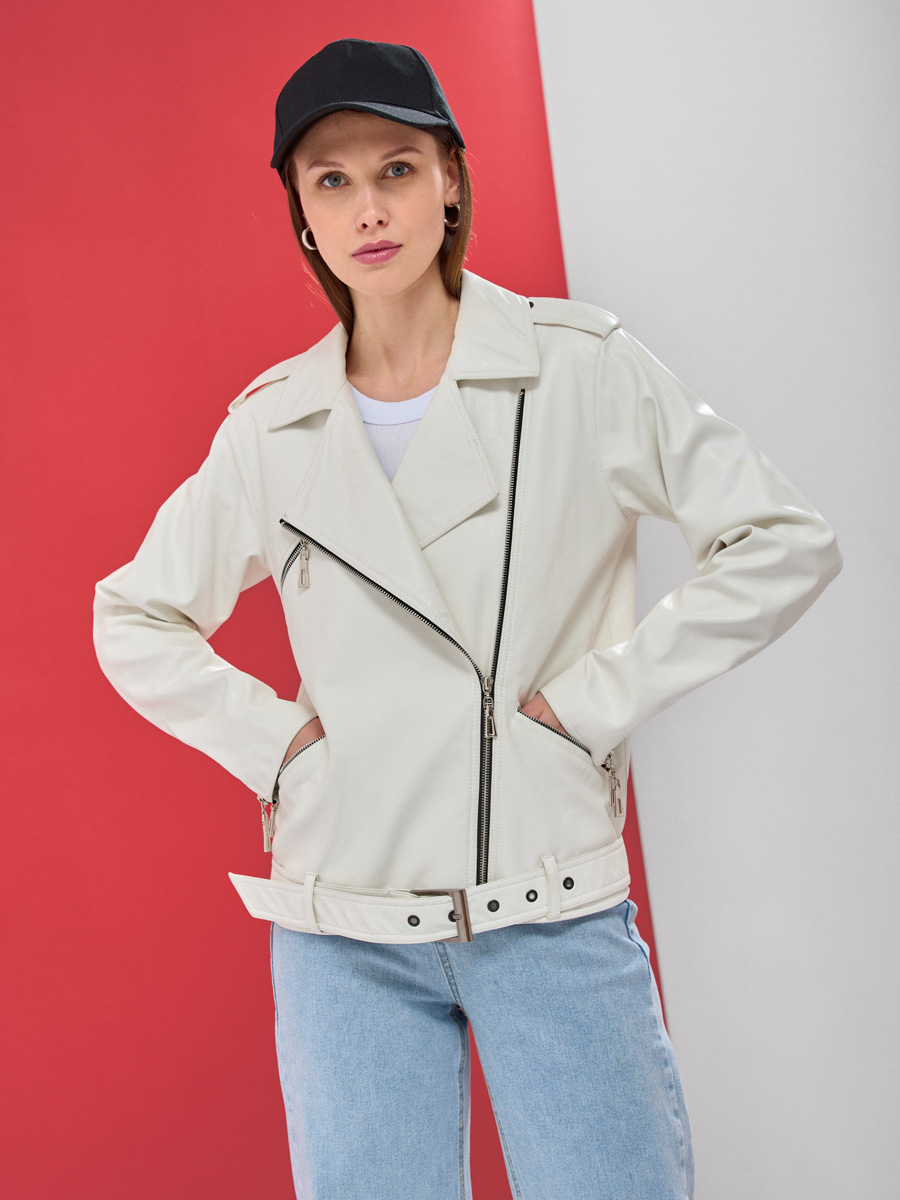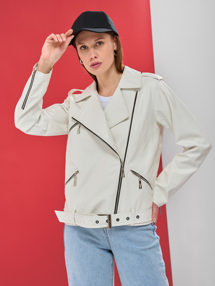 Куртка-косуха из эко-кожи прямого силуэта, на подкладе, с отложным воротником и застежкой «молния». Рукав втачной длинный двухшовный с молнией по низу. На плечах декоративные погоны с кнопками. Куртка задекорирована двумя прорезными карманами на полочке и одним декоративным, с застежкой на молнию. Низ изделия украшает съемный пояс из основной ткани с пряжкой. Рост модели 175 см. Изделие на модели 42р-ра. Длина изделия 57,7см. Рекомендация по уходу химчистка.