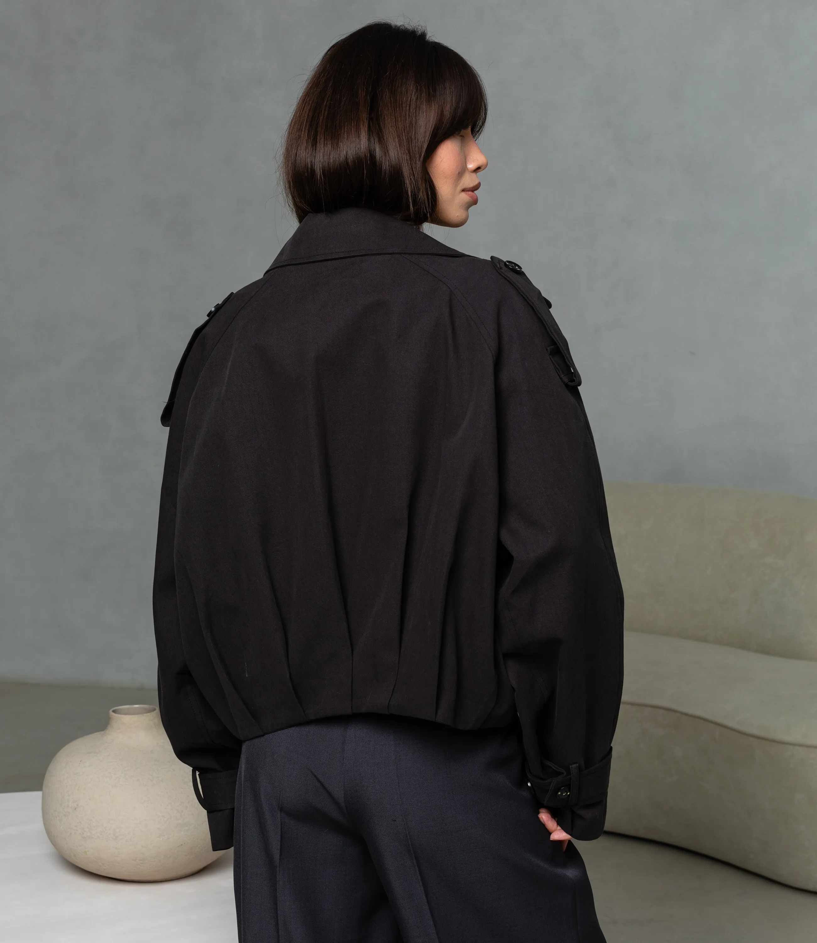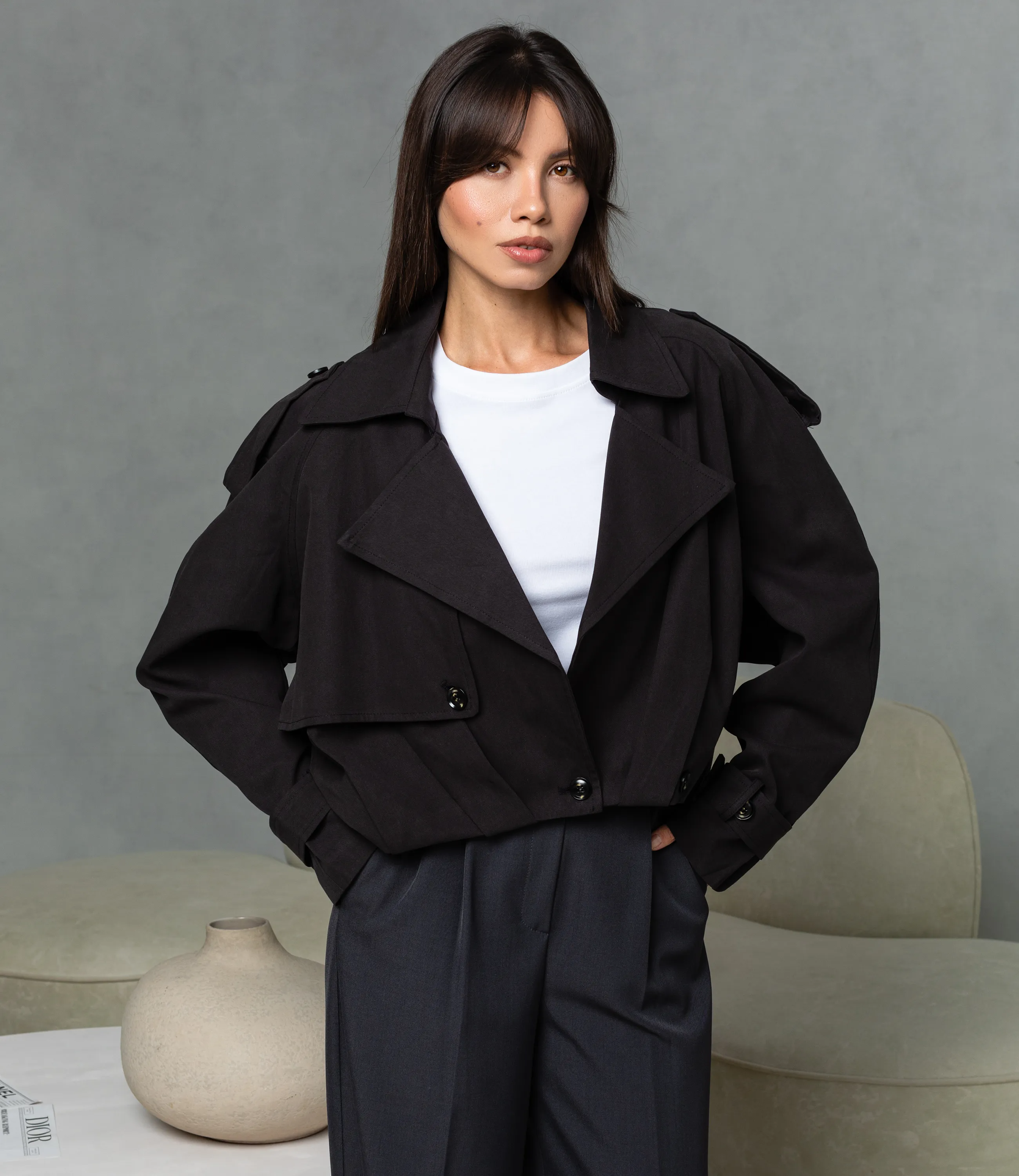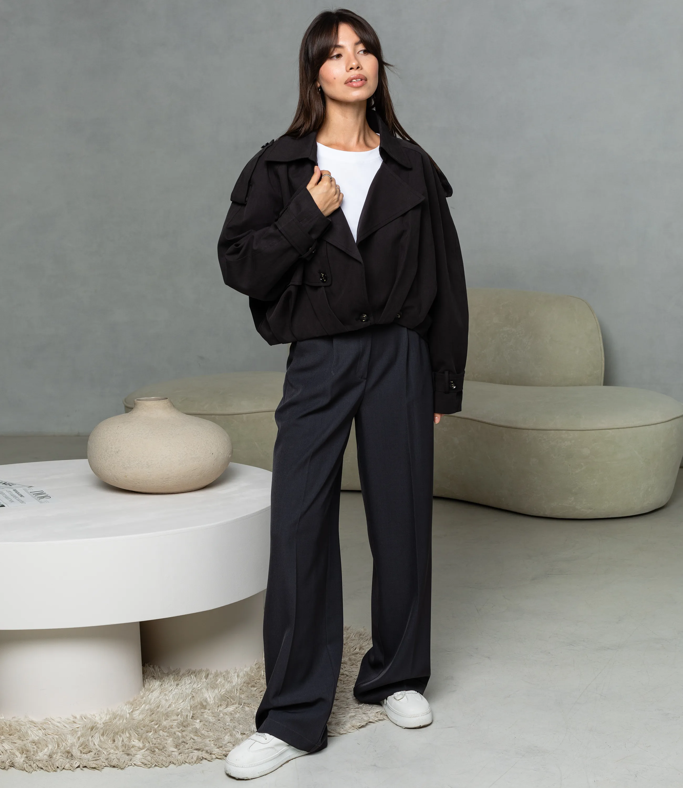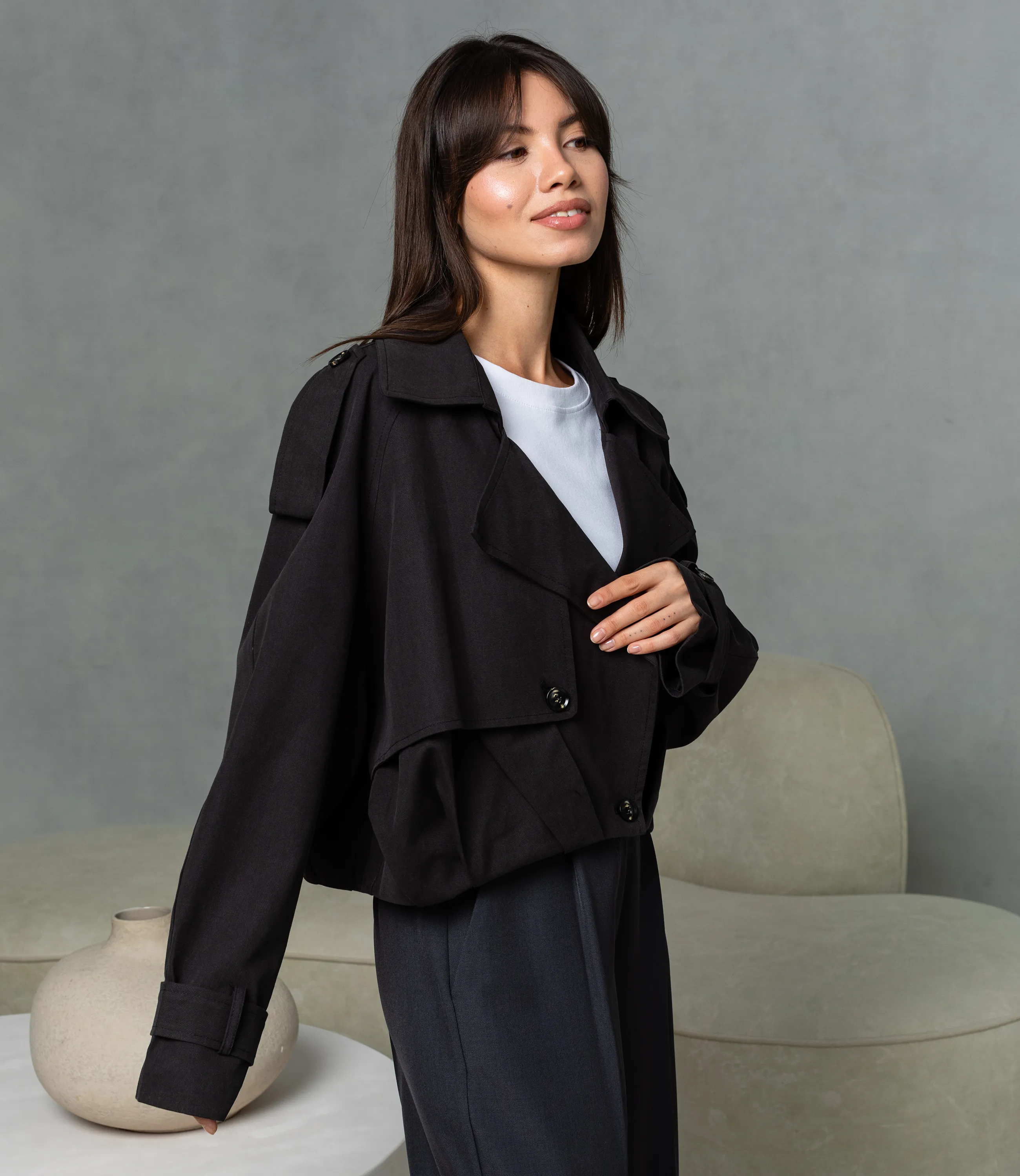 Куртка — это часть гардероба, которая подчёркивает привлекательность и индивидуальность каждой покупательницы. Рукава длинные, прямые, с манжетами на пуговицах и регулируемыми шлевками; линия плеча мягко спущена, что придаёт силуэту расслабленность. Застёжка на две видимые пуговицы в нижней части, пуговицы округлые и блестящие; по бокам — скрытые швы карманов-весточек. Короткая укороченная куртка с широкими лацканами и двубортной планкой, выполненная из плотной структуры ткани с лёгкой драпировкой. Для пошива использованы 80% хлопка и 20% полиэстера, сочетание натурального комфорта и синтетической надёжности. Хлопок обеспечивает приятные тактильные ощущения и хорошую воздухопроницаемость, полиэстер придаёт прочность, устойчивость к смятию и выцветанию, облегчает уход и увеличивает стойкость изделия при частых стирках. Рекомендуем позиционировать куртку как ключевой элемент капсулы smart casual, сочетая её с брюками высокой посадки, юбками‑карандаш или худи. Визуально подчёркивайте контраст текстур рукавов в витрине и онлайн‑карточке, предлагайте несколько базовых оттенков и одну‑две акцентные версии для увеличения оборачиваемости. Рост 164 см, 83-61-89.