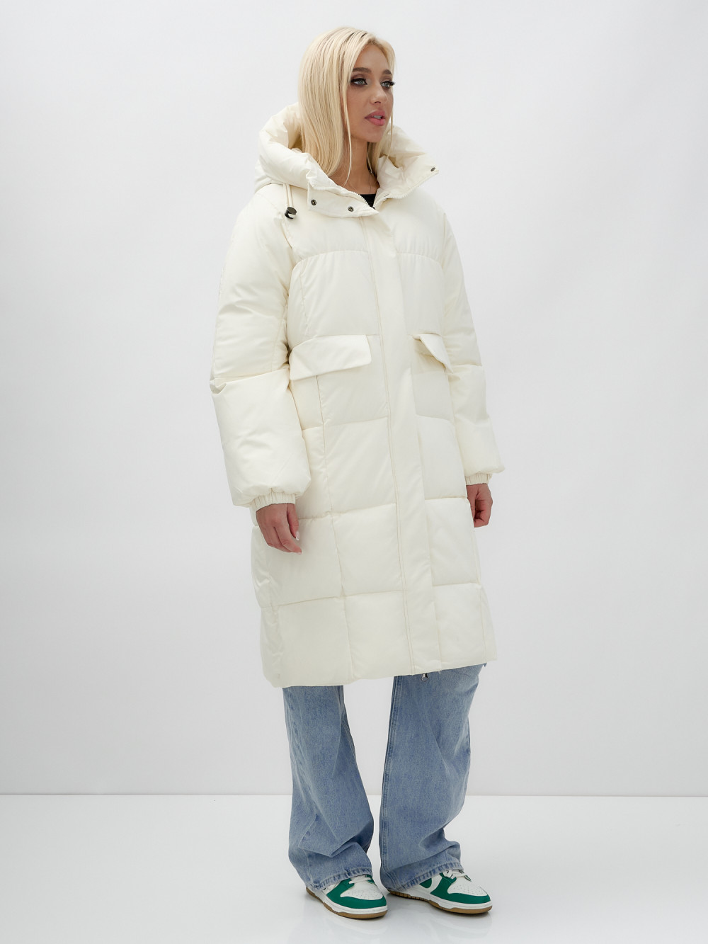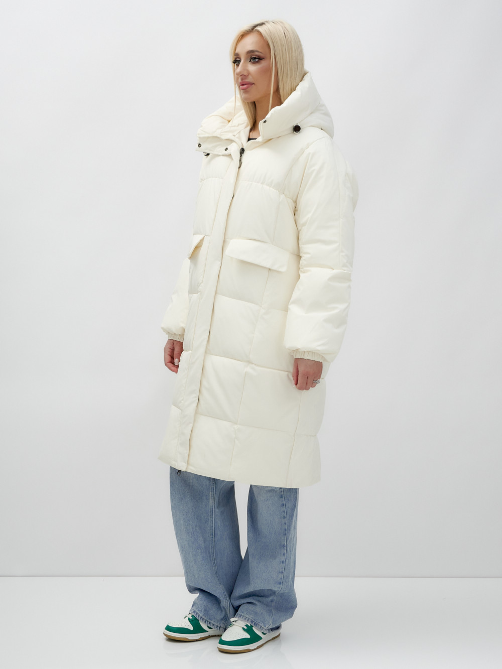 Куртка летучая мышь женская с капюшоном зимняя бежевого цвета 9621B