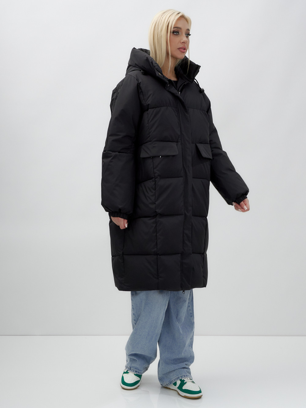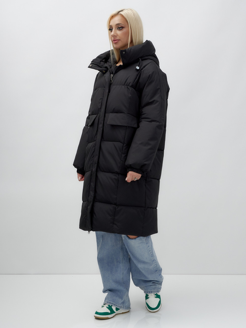 Куртка летучая мышь женская с капюшоном зимняя черного цвета 9621Ch