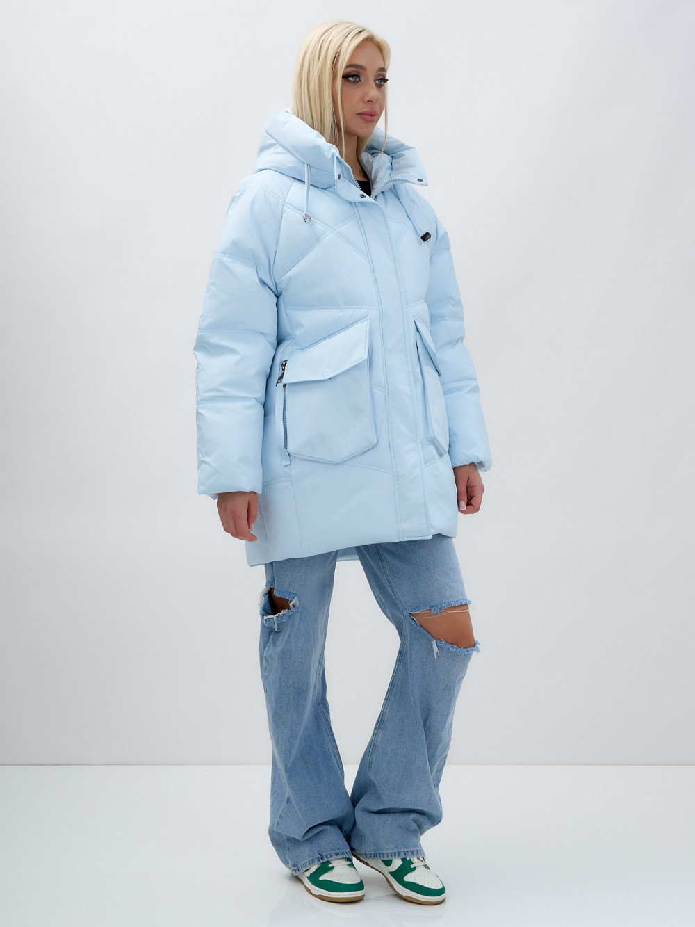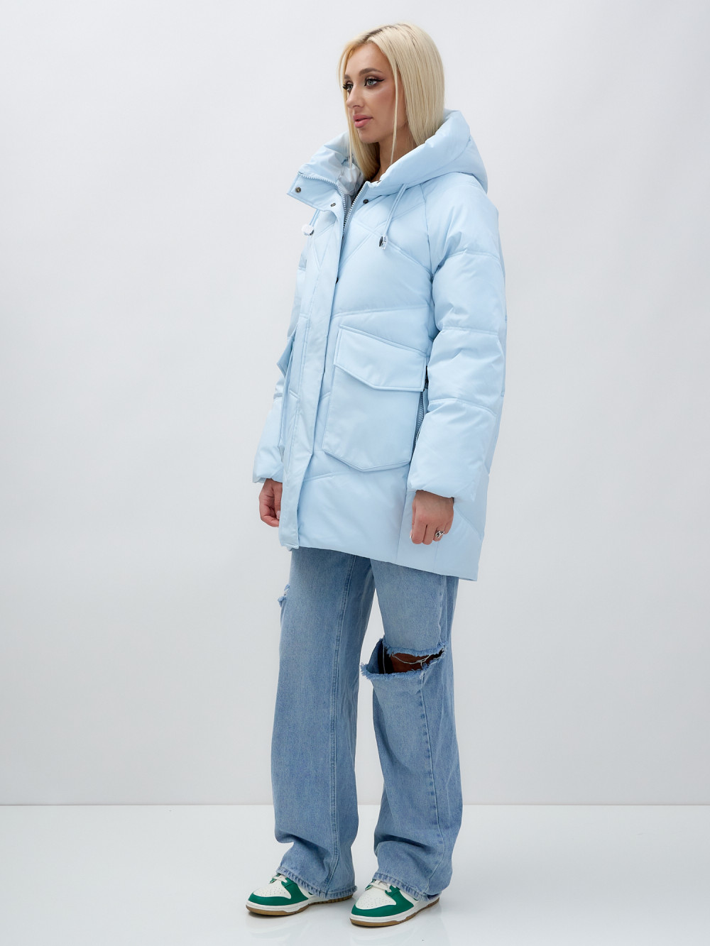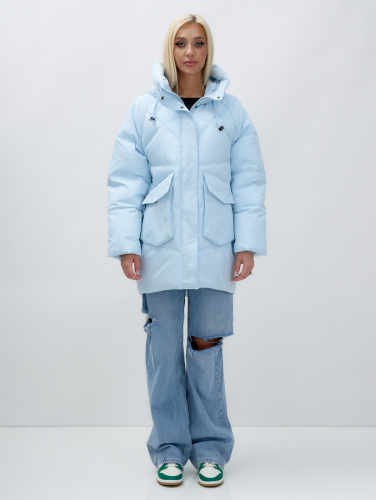 Куртка летучая мышь женская с капюшоном зимняя голубого цвета 9617Gl